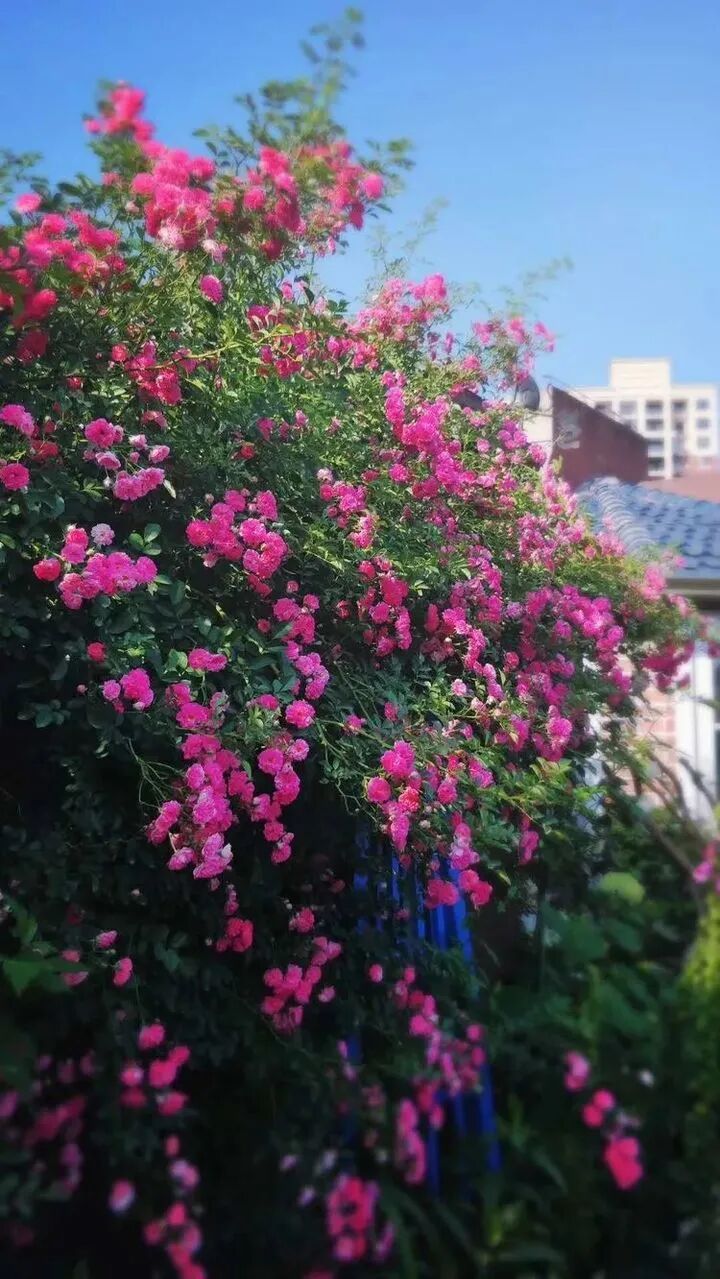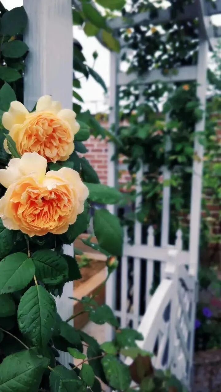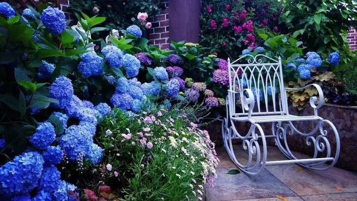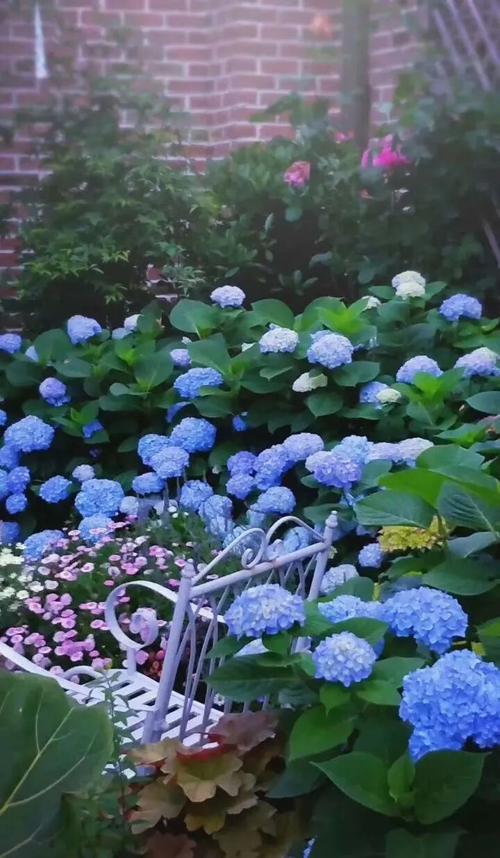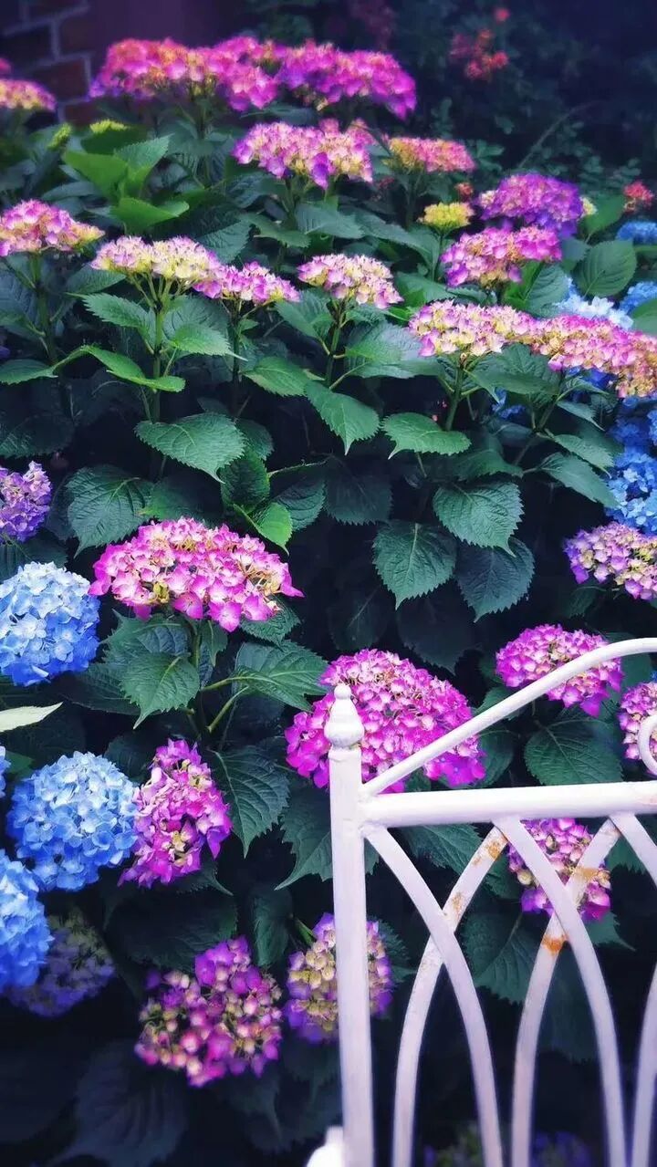 以绣球花为中景,以月季藤蔓作为远景植物,