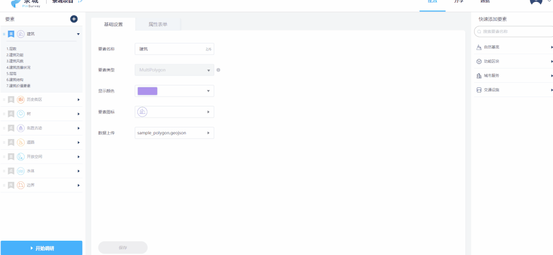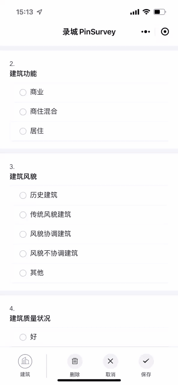 针对每一个类型的要素,除了完善的要素图标库,录城PinSurvey还提供了详细的调研内容模版:如建筑功能性质、年代、层数等风貌特征,包括产权等社会经济指标,以最简洁的方式覆盖了大部分的调研要求,一键开始调研,省时省力。