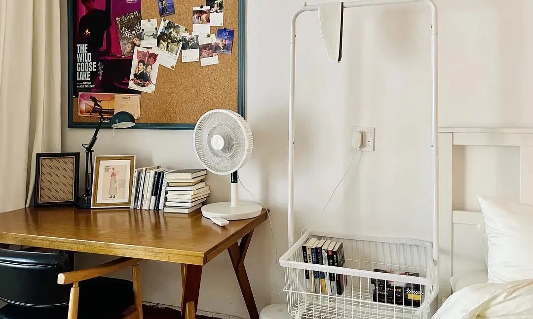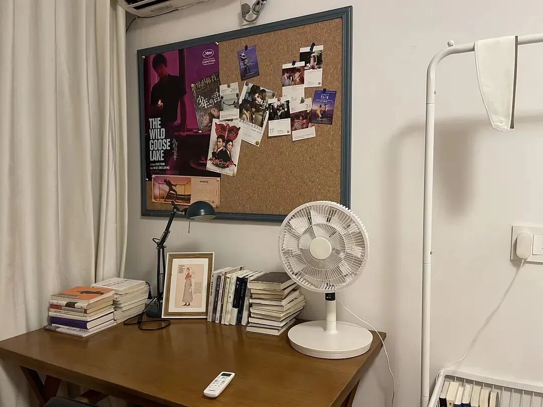 靠近落地窗的一侧,靠墙放置了一张书桌,原木色系与落地窗相呼应,书桌前是一面照片墙,陈先生把喜欢的画报和照片都贴在这里,简单又温馨。