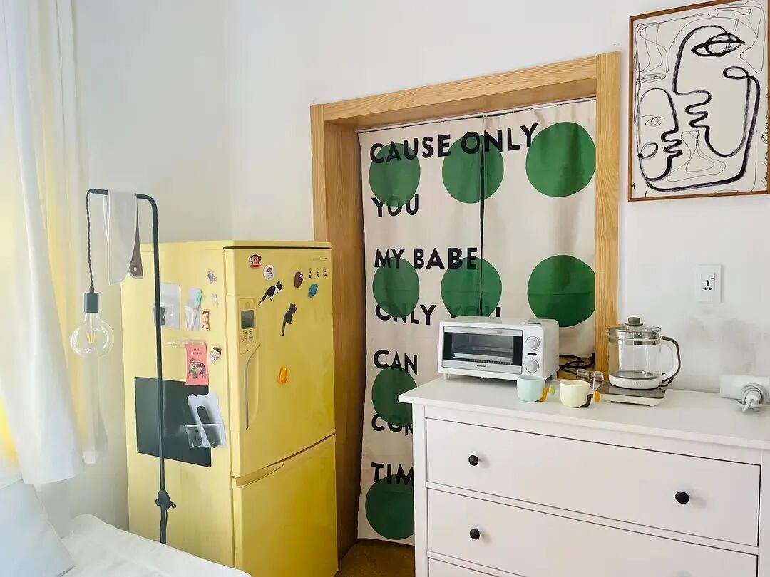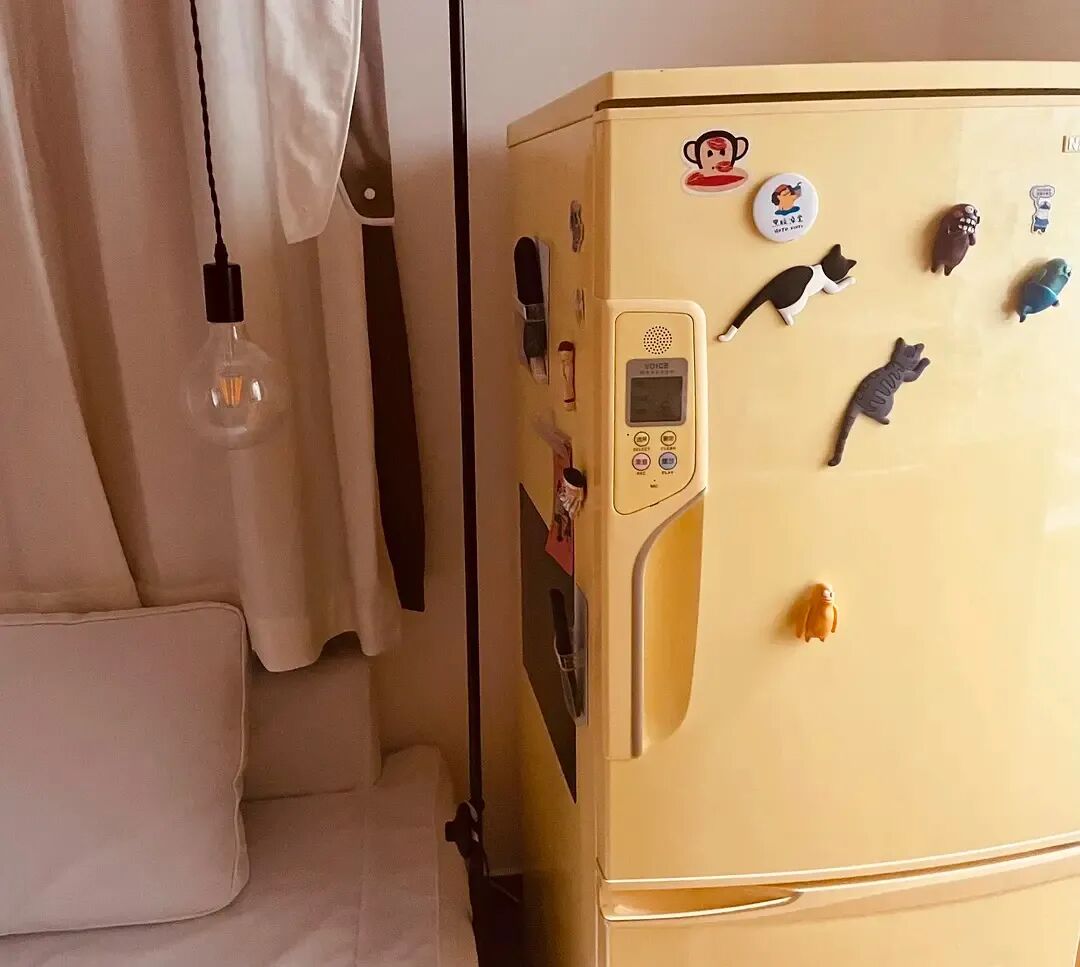 客厅里的黄色小冰箱,是从闲鱼上淘来的二手货,12年的松下冰箱。陈先生特地开着皮卡去上海带到新家,装饰上冰箱贴,放在家里,复古又可爱。