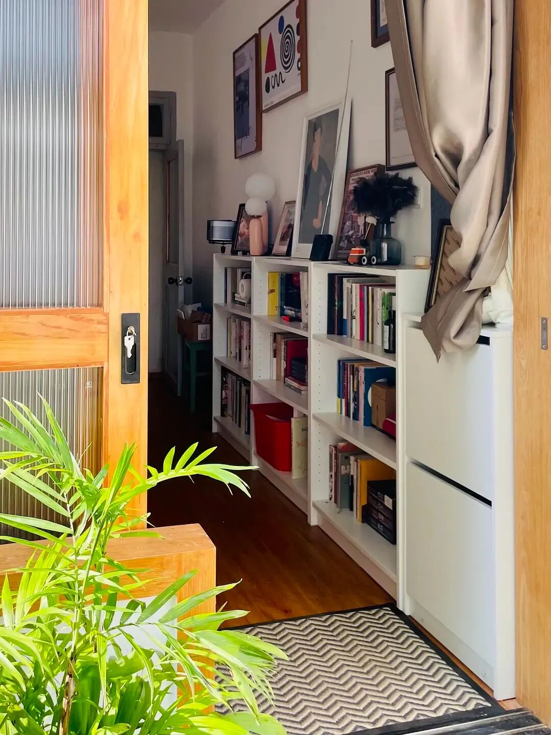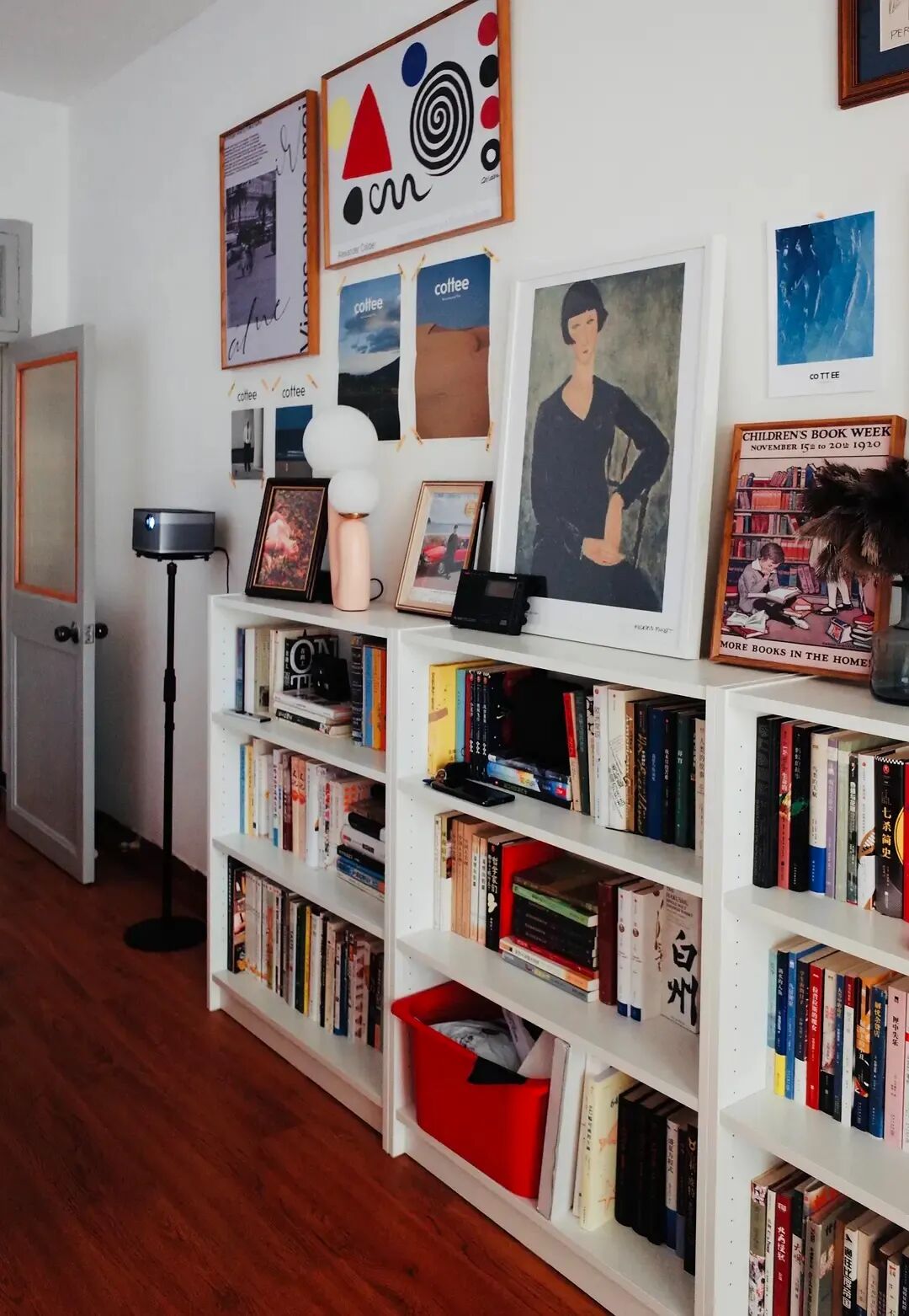 与玄关相连的柜子作为书柜和展示区,书柜上方,摆着挂着各种装饰画、画报,布置出一种小画廊的感觉。