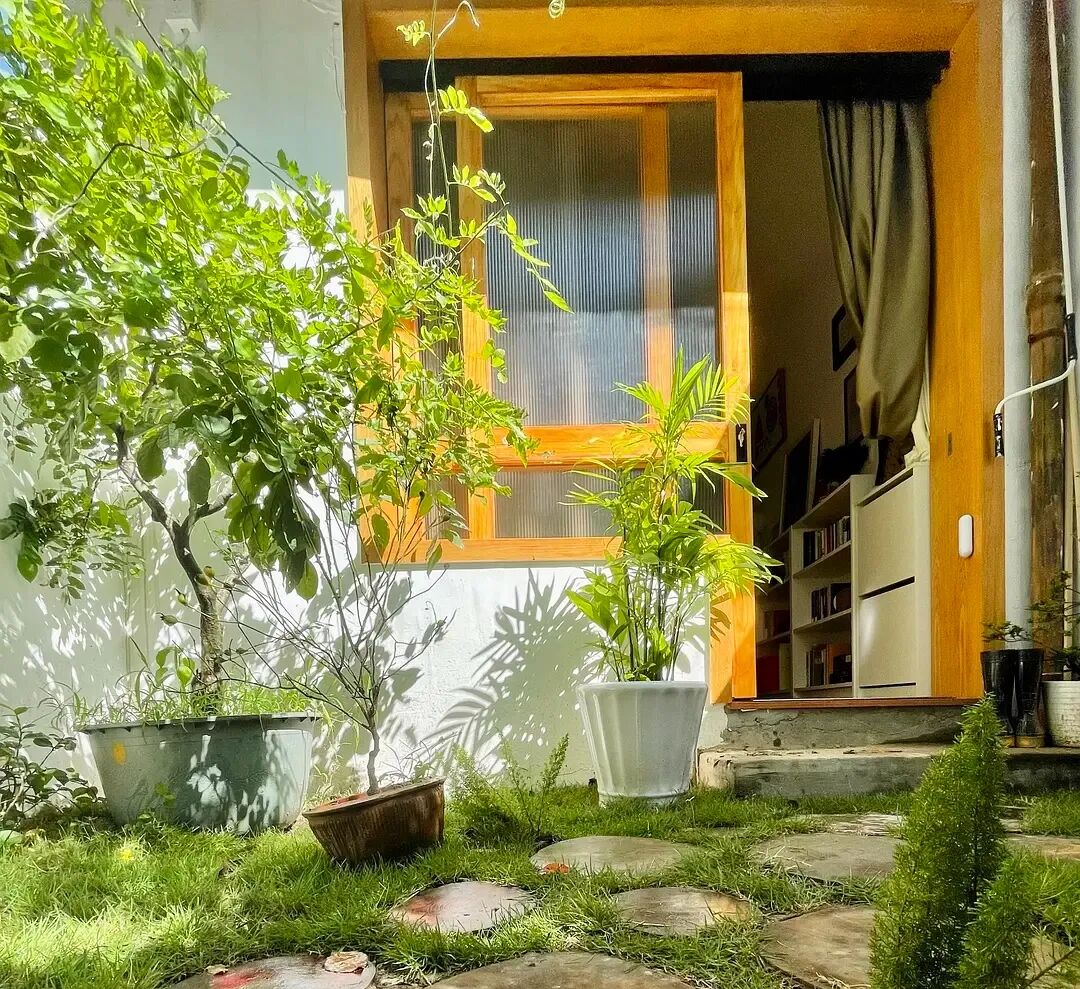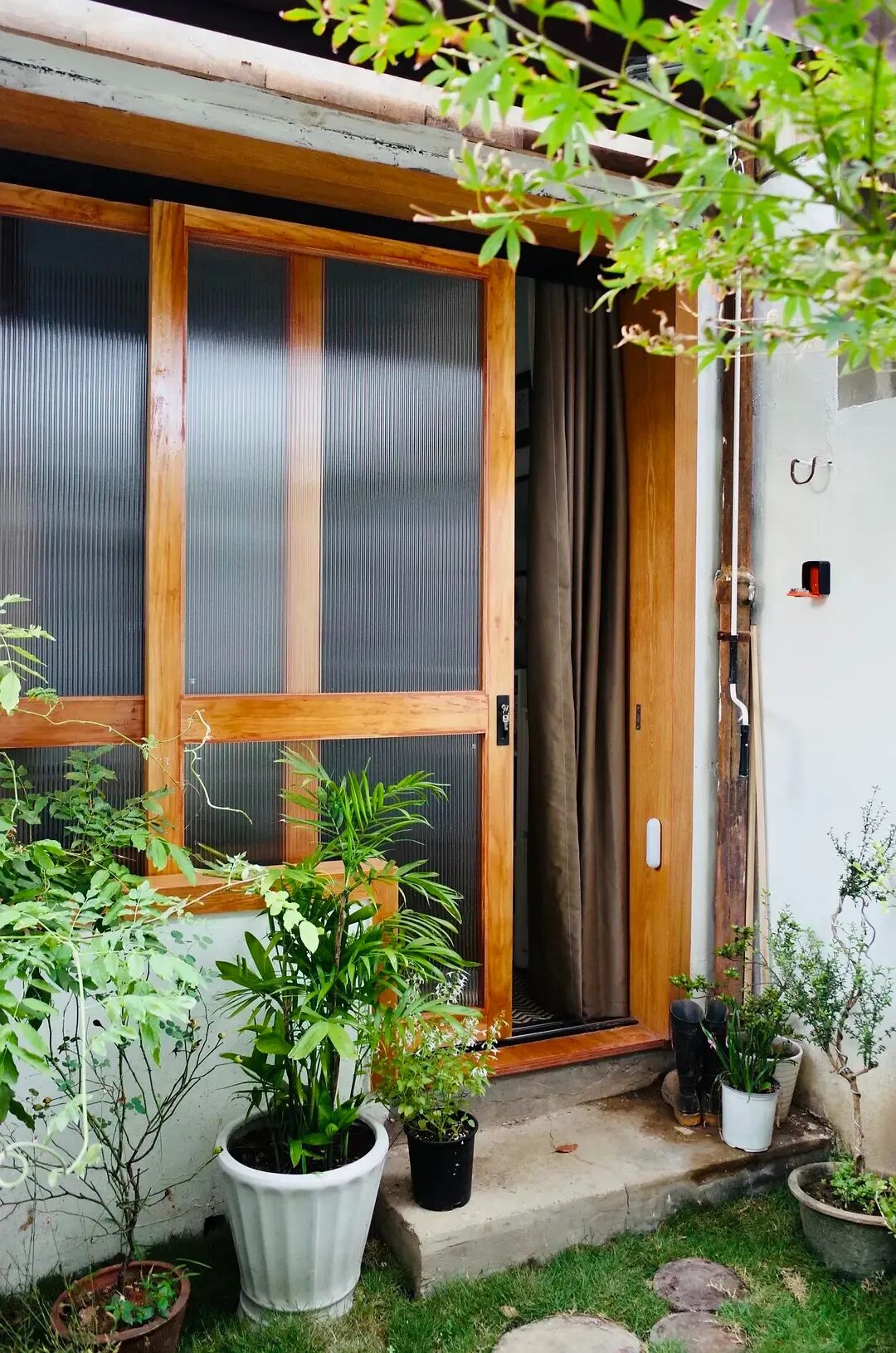 原先老派的小门小窗被拆除,用一扇原木色边框的组合门窗代替,搭配长虹玻璃,既然改善了室内采光,又保护了隐私。
