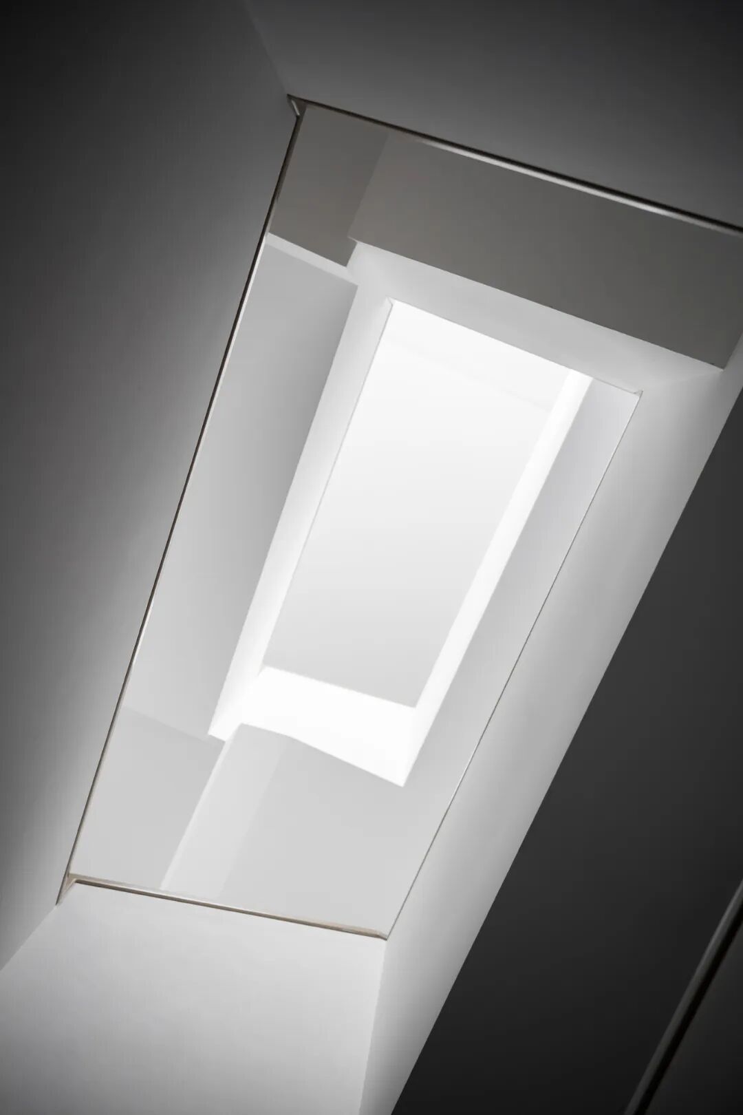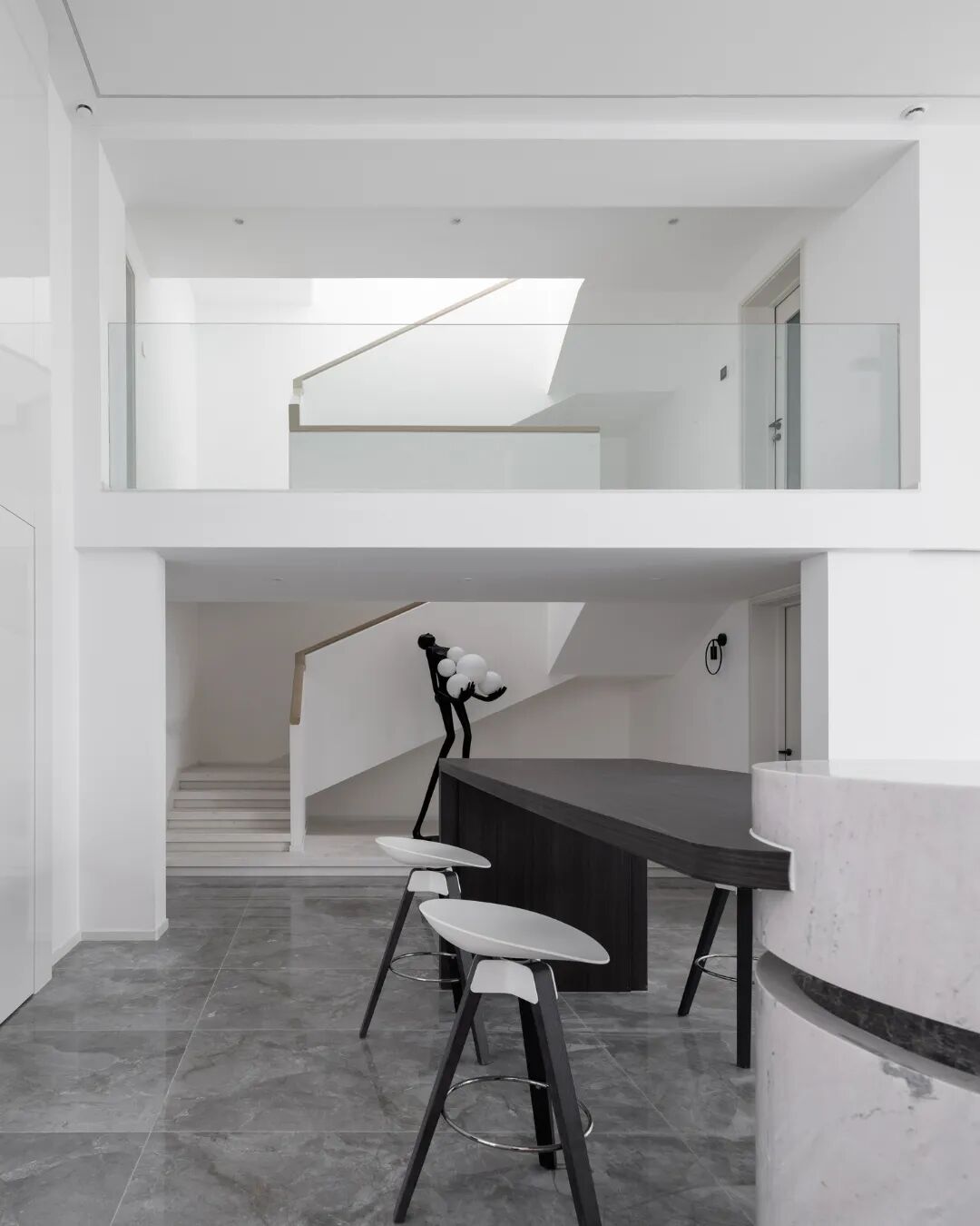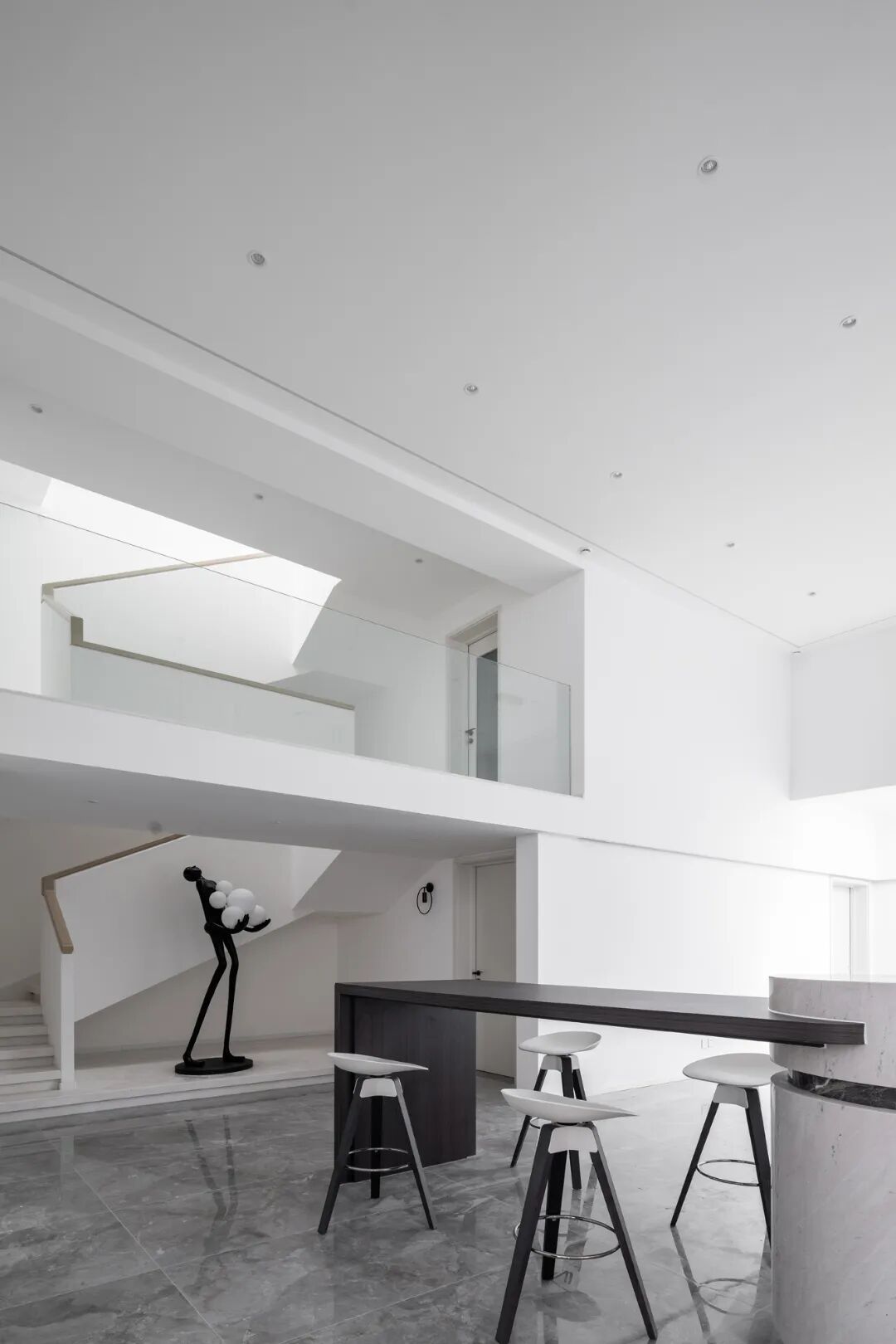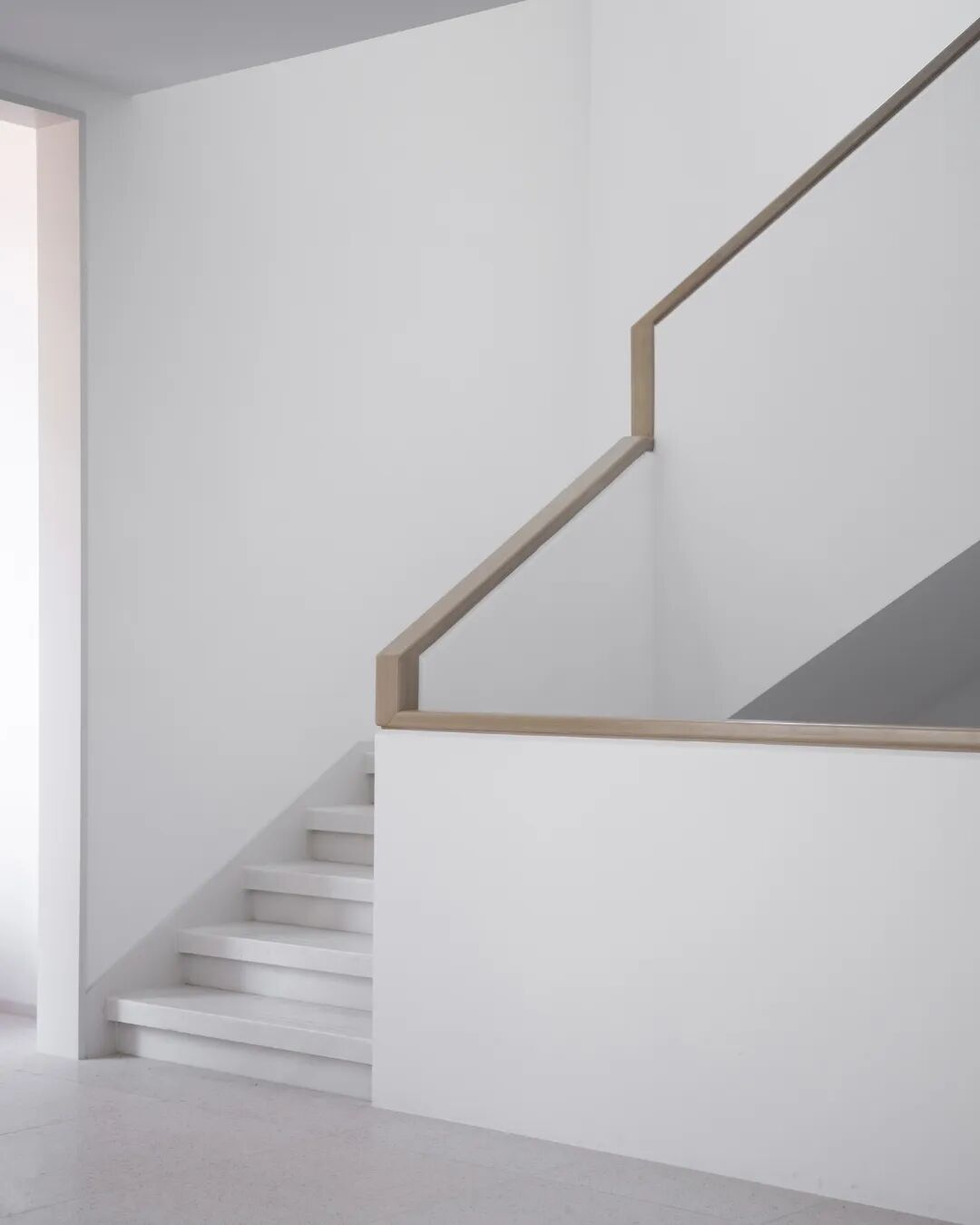 纯白色的楼梯,只以木框出扶手的边界,在手触摸的一刻感受材质的温度,甚至是一丝微凉,从肌肤传导到内心。
