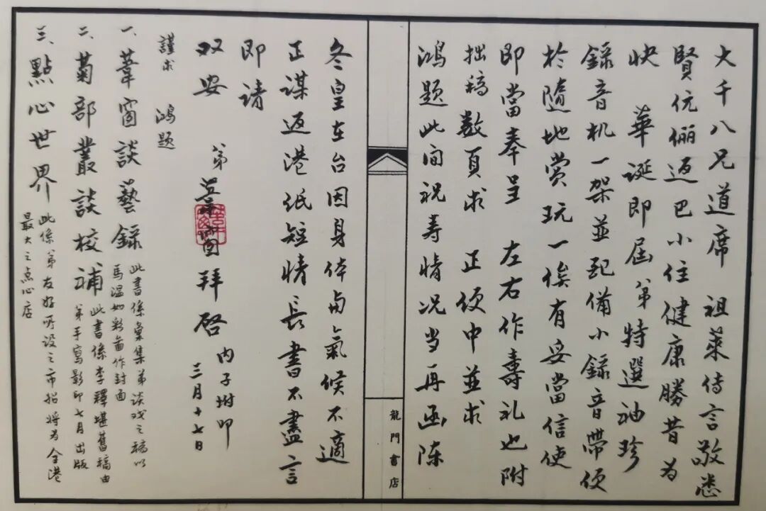 大千八兄道席。 祖莱传言敬悉 贤伉俪返巴小住,健康胜昔为快。 华诞即届,弟特选袖珍录音机一架并配备小录音带便于随地赏玩。一俟有妥当信使即当奉呈。 左右作寿礼也。附拙稿数页,求 正。便中并求 鸿题。此间祝寿情况当再函陈。冬皇在台因身体与气候不适,正谋返港。纸短情长书不尽言。即请 双安。弟苇窗拜启。内子附叩。三月十七日。谨求 鸿题 一、苇窗谈艺录(此书系汇集弟谈戏之稿以马温如彩图作封面) 二、菊部丛谈校补(此书系李释堪旧稿,由弟手写影印七月出版) 三、点心世界(此系弟友好所设之市招,将为全港最大之点心店)。