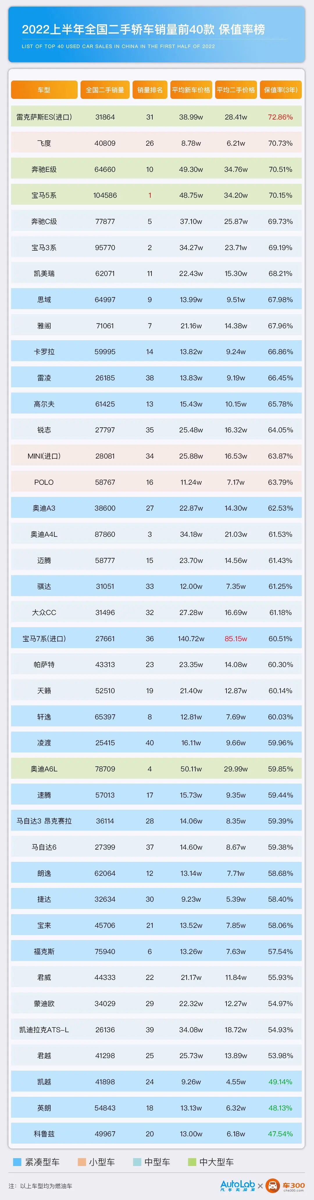 为了让保值率给消费者在省钱上发挥更大作用,我们联合车300,整理了2022上半年的二手轿车的销量数据,选取了前40名并附上价格等信息和大家分享。