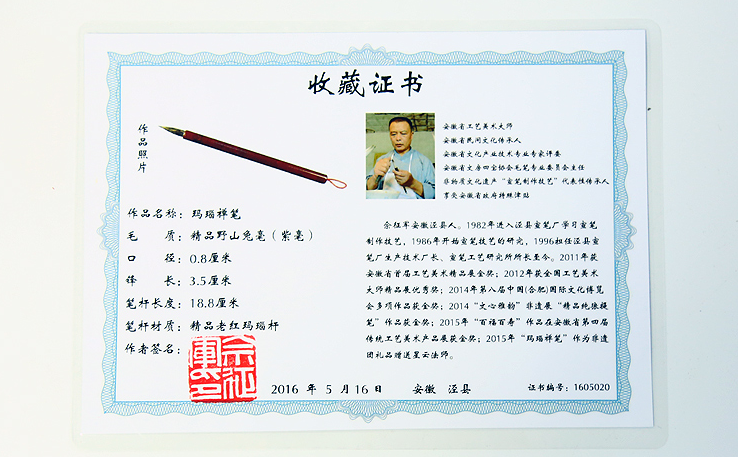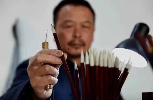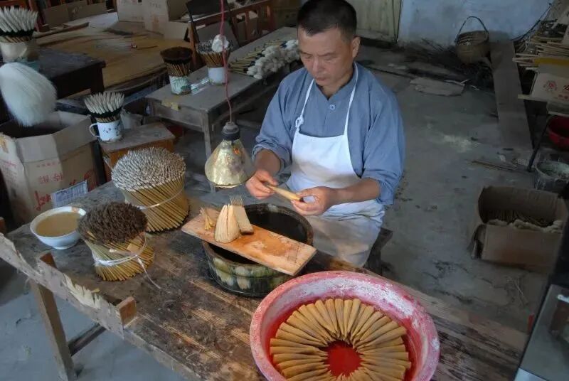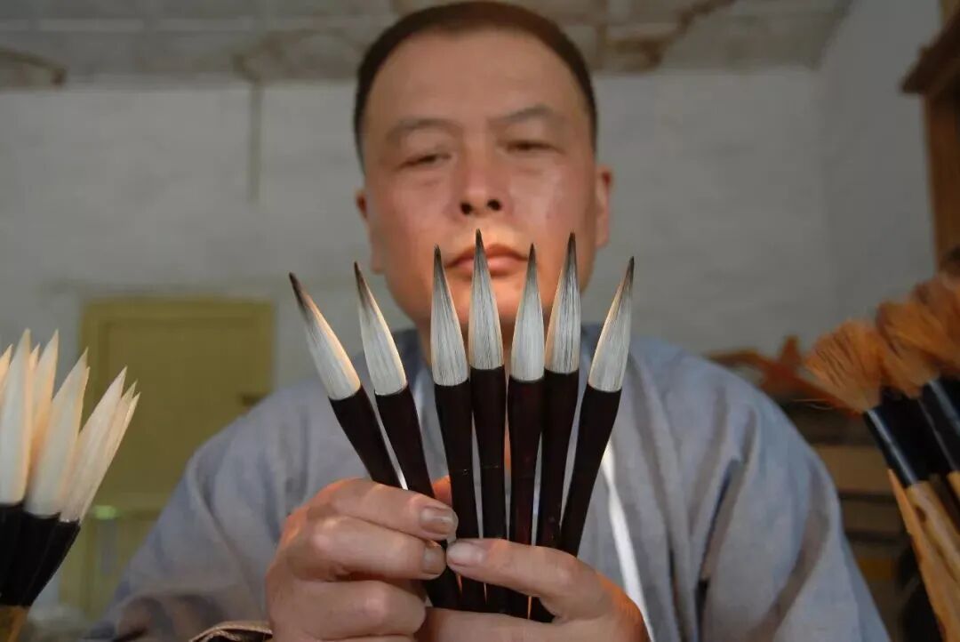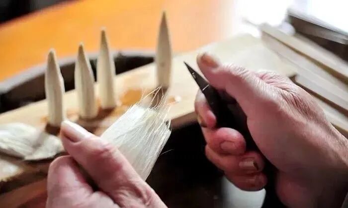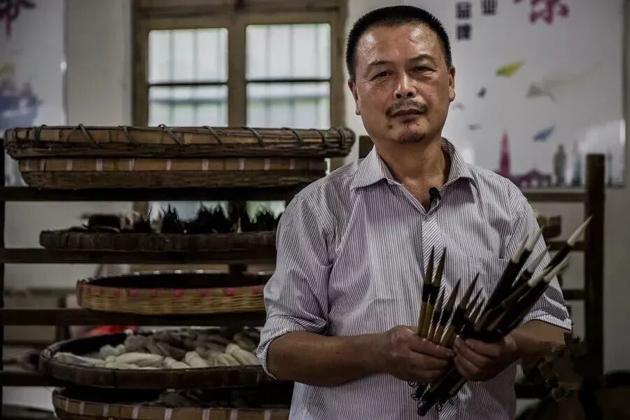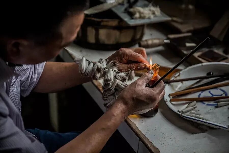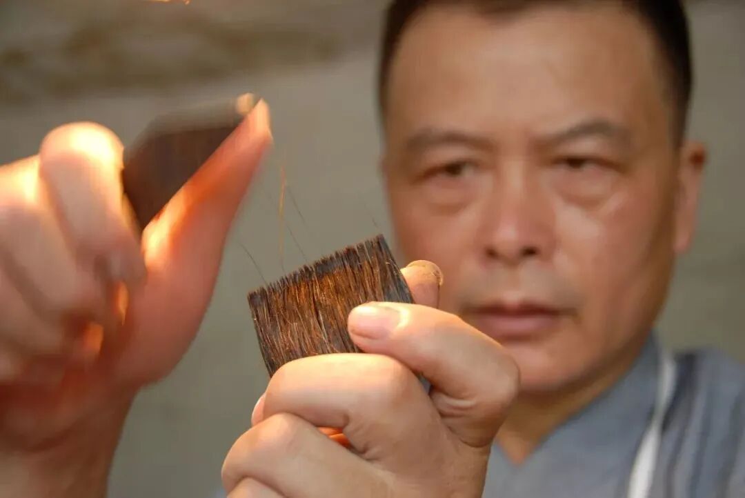 最新文章2024-03-09 40年专注一支笔,他成国家非遗技艺传承人,一支仅需百来元 2015年,与星云大师结缘的一支玛瑙禅笔,惊艳了书画界。 这支笔笔杆为红玛瑙,笔头是紫毫,极其珍贵。 不解其中趣的人可能会有疑惑:一支笔而已,究竟能有多神? 实际上,早在唐朝时,紫毫笔就被打上了“贡品”“比金贵”的标签。诗人白居易的诗中,就明确描述了紫毫笔的不易得—— 紫毫笔,尖如锥兮利如刀。 江南石上有老兔,吃竹饮泉生紫毫。 宣城之人采为笔,千万毛中拣一毫。 每岁宣城进笔时,紫毫之价如金贵。 …… 如果说原料的贵重,奠定了紫毫笔千金难买的基础。那足足108道精密繁琐的制作工艺,则赋予了紫毫笔一笔难求的灵魂。 而这只横空出世、惊艳众人的玛瑙禅笔,正是出自宣笔制作技艺国家级非遗代表性传承人佘征军之手。 宣笔制作技艺国家级非遗代表性传承人 佘征军 提起宣笔的制作工序,那真是三天三夜都说不完。 选料、水盆、制杆、装套……整个流程下来,足足108道工序。这其中的每一步,只有在其中沉浸多年的老匠人,才能领悟出诸多门道。 从最初的采毛,就大有讲究。 “别看都是毛,每种毛的性格是完全不一样的,有的柔软挂墨,有的强韧高弹。 如果摸不透这些毛的特性,没有将它用在它该在的位置上,哪怕是再高档的毛,做出的宣笔也算不上好宣笔。” 在佘征军看来,上等的动物毛如千里马,可遇不可求。 而合格的制笔匠人,首先要有的,是一双慧眼。 为了不同种类宣笔的毫料,佘征军经常亲自去各地选购最好的兔毛、黄鼠狼尾尖毛、山羊毛、石獾毛等。 选购来的毛皮,需进行采毛。 坐在桌案前,背脊微弓,一手固定毛皮,一手反复前拨,短短几秒钟,下手干脆利落,不同质量的毫毛就被分层归类。 采毛后,整个流程算是开了个头。接下来的水盆工艺,才是宣笔制作的重中之重。 这个过程,需要在石灰水盆里操作。 坐在水盆前,背脊微弓,这是佘征军的固定坐姿,一坐就是近40年。 首先,要将毫毛泡在石灰水中,去除毫毛的油脂和腥味。这部分要严格把握石灰水浸泡的时间,时间太短则油脂祛除不净,浸泡太久则会损伤毫毛。 石灰水褪去了毫毛上的油脂,也让佘征军的双手变得粗糙不堪。到了冬天,冰冷的石灰水更是对心性的磨炼。 但佘征军没有为其所苦。 褪去油脂的毫毛,并非根根可入笔,它们还需要经过选毫。这次挑选如“沙里淘金”,需要目不转睛地一根根挑选。 先选出长短粗细,再按扁圆曲直、有锋无锋,剔除杂毛、断毛、弯毛,最终挑选出刚中有柔、柔中有刚的上等毫料。 在毫料的挑选上,佘征军有自己的严苛标准。有些部位的毫料,即使盛名在外,也不一定能入得佘征军的法眼。 宣城泾县的黑褐色山兔,因毫毛欣长丰润而为业界所知。因其昂贵而不易得,很多制笔匠人会将它身上所有的毫毛都用来入笔。 但佘征军只选择山兔脊背到兔尾那一小段。这个部位的毛发比其他部分的更圆润饱满,是紫毫中的佼佼者。 用这部分毫毛制作而成的宣笔,才当得起紫毫的名声。 正如白居易诗中所云—— “紫毫笔,尖如锥兮利如刀。江南石上有老兔,吃竹饮泉生紫毫,宣州之人采为笔,千万毫中拣一毫。每年宣城进笔时,紫毫之价如金贵。” 毫毛选取过后,接下来是除绒毛。 动物的毛发大致可分为三层,最外层的毛鳞片,决定了宣笔的挂墨量和出墨速度。除绒毛除的就是这层毛鳞片。 将选出来的毫毛根根码齐,一手捏紧毛料根部,一手以骨梳梳理,将毛鳞片均匀剔除。 这个过程需要用心去感受。 毛鳞片过少,则宣笔无法很好地裹墨,下墨速度会很快,不易控制;毛鳞片过多,则下墨不流畅,不利于书写。 接下来,齐毛锋、切毫根、梳断毛、配毛料、扎笔头、做笔管、装笔头…… 一百多个环节环环相扣,只有每一步都用心对待,才能做出一支满足“尖、圆、齐、健”四德的优秀宣笔—— 所谓尖,指笔锋尖如锥,这样才能有利于书写钩、捺等笔画; 所谓齐,指笔毛铺开后锋毛平齐,这样有利于吐墨均匀; 所谓圆,指笔根圆润饱满,笔头“抱”在一起,这样书写时才能流利顺畅不开叉; 所谓键,指笔锋要有弹性,这样在使用时才能显笔力,现功底。 从1982年进入宣笔厂开始毛笔制作生涯,到如今成为工艺美术大师、宣笔工艺研究所所长、宣笔制作技艺国家级非遗代表性传承人, 佘征军将大半辈子的光阴,都奉献给了他钟爱的宣笔事业。 在外人看来,制作宣笔的过程满是繁琐与枯燥,但在佘征军看来,埋头与水和毛发对话的过程中,每一次都有新的感受,进一寸便有一寸的欢喜。 制作宣笔之余,佘征军还喜欢练习毛笔字。 “中国人,还是要写点毛笔字的”。 在他看来,中国汉字之美,是毛笔给的。一横一竖,一撇一捺,一点一弯钩,无不酝酿在毛笔毛尖的起承转合里。 从隶书、草书、楷书、行书,不同的字形,有不同的气质,它们也需要用不同脾气的宣笔去表现。 如果一个宣笔匠人不会写字,又何以制作出好用的笔? 除了书法,中国画也离不开宣笔。为了制作出更适于绘制中国画的宣笔,佘征军还经常与书画大家交流用笔需求。 绘制花卉时常用的“没骨法”,最好选择裹墨较好的狼毫笔;表现山水枯石的“皴擦法”,弹性好的宣笔才能更好表现苍劲感。 只有“知己知彼”,才能“百战不殆”。 正因为如此,他制作的宣笔深受书画家的喜爱。由他制作的“红玛瑙铁头紫毫笔”,更是被世界技能博物馆所