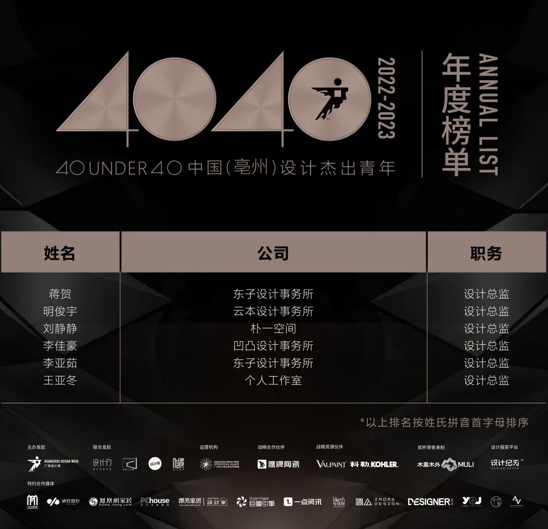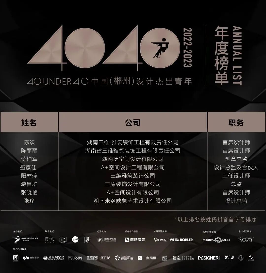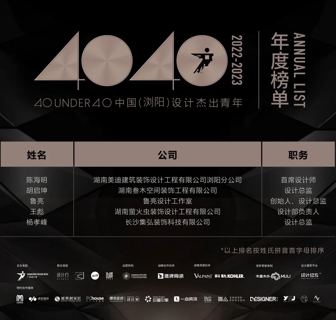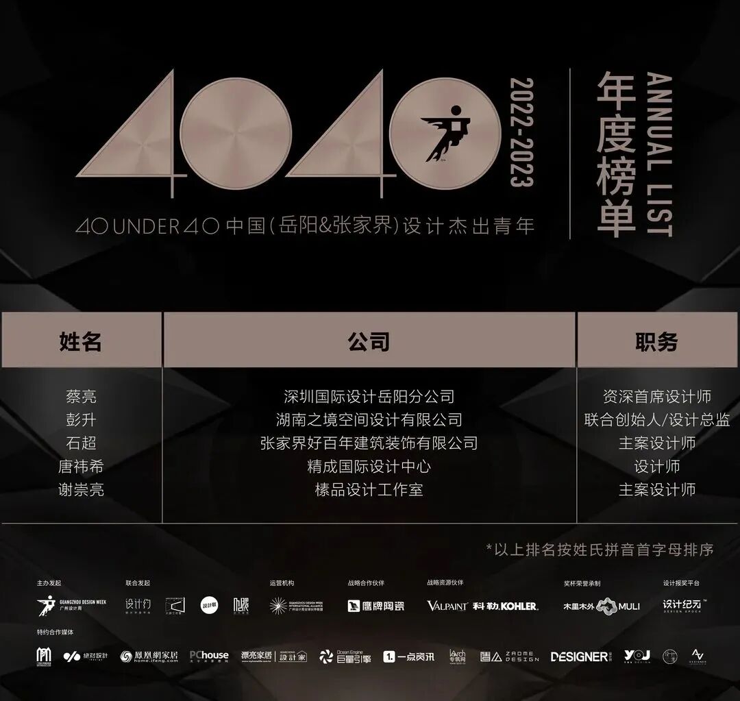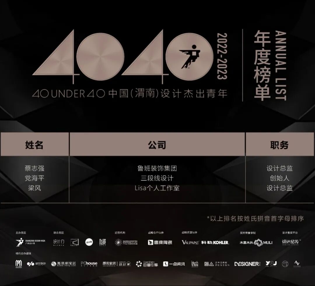 “40 UNDER 40中国设计杰出青年”年度榜单由广州设计周在IFI认证、全球同步推广的专业背景下于2016年发起,每年度通过举办“城市榜、省区榜、全国榜”等核心内容,发布并表彰城市/省区/全国不超过40位40岁(含)以下在室内设计、建筑设计、园林景观设计及关联领域具有卓越表现和专业成就的青年设计师,旨在推动中国设计中坚力量合力成长,彰显中国设计精彩纷呈的征途篇章。