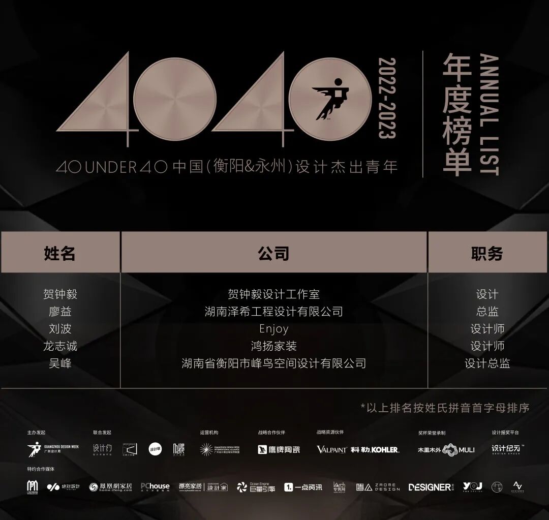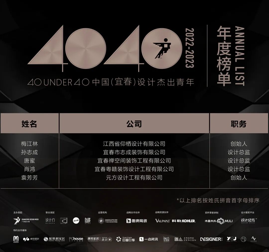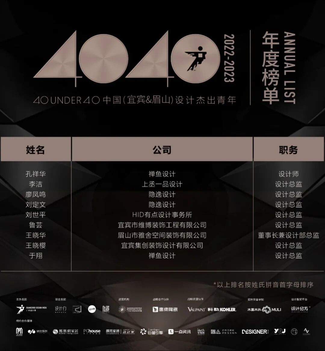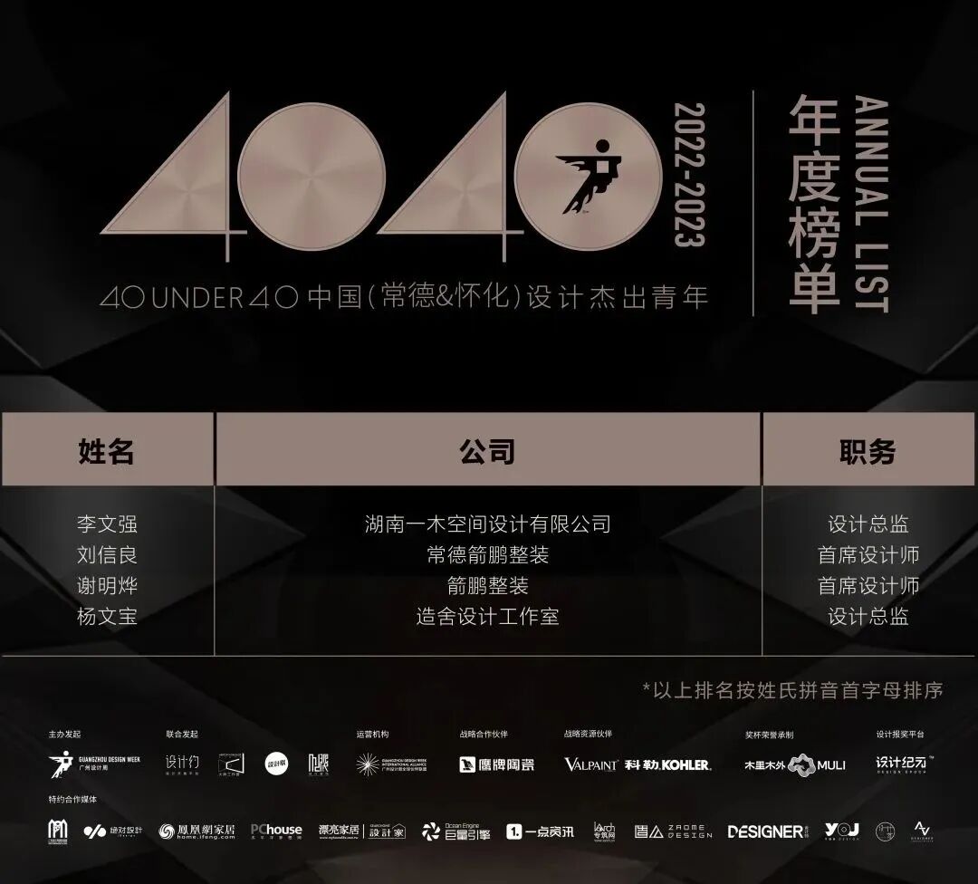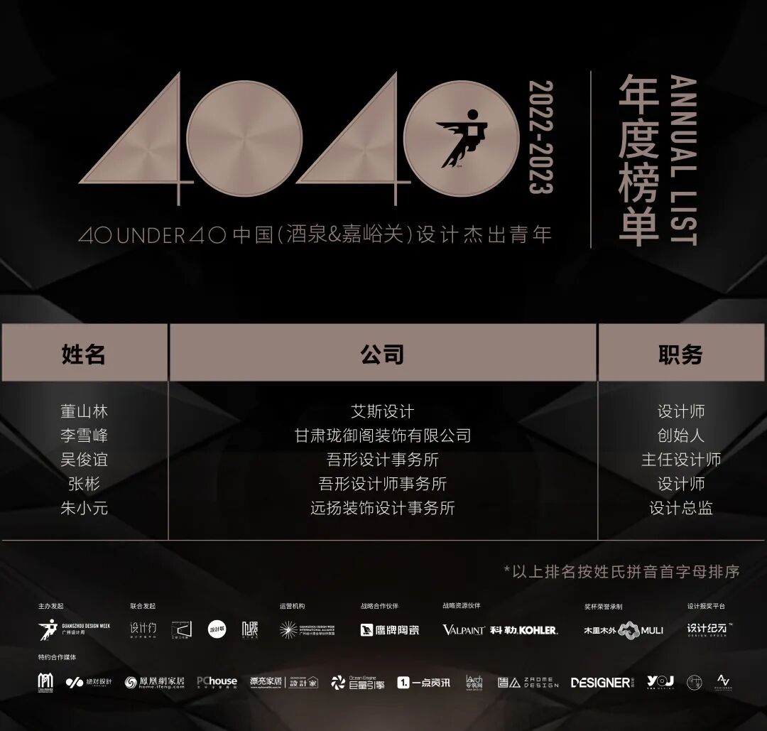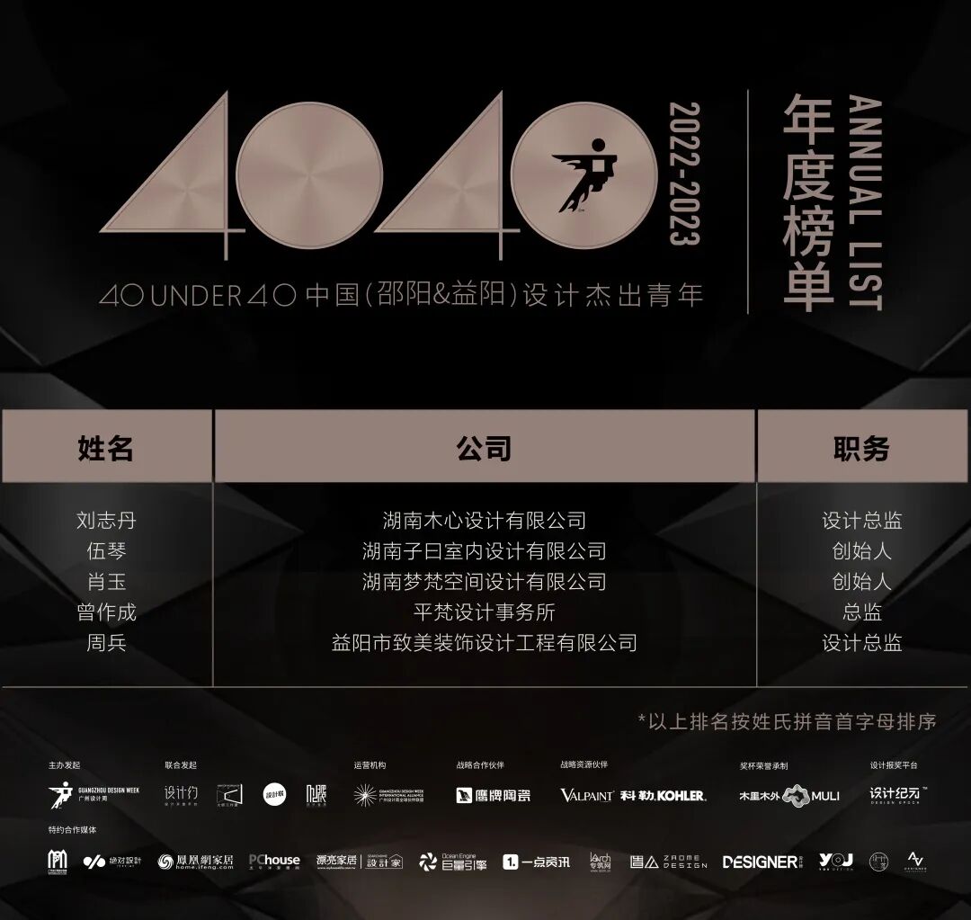 “40 UNDER 40中国设计杰出青年”年度榜单由广州设计周在IFI认证、全球同步推广的专业背景下于2016年发起,每年度通过举办“城市榜、省区榜、全国榜”等核心内容,发布并表彰城市/省区/全国不超过40位40岁(含)以下在室内设计、建筑设计、园林景观设计及关联领域具有卓越表现和专业成就的青年设计师,旨在推动中国设计中坚力量合力成长,彰显中国设计精彩纷呈的征途篇章。