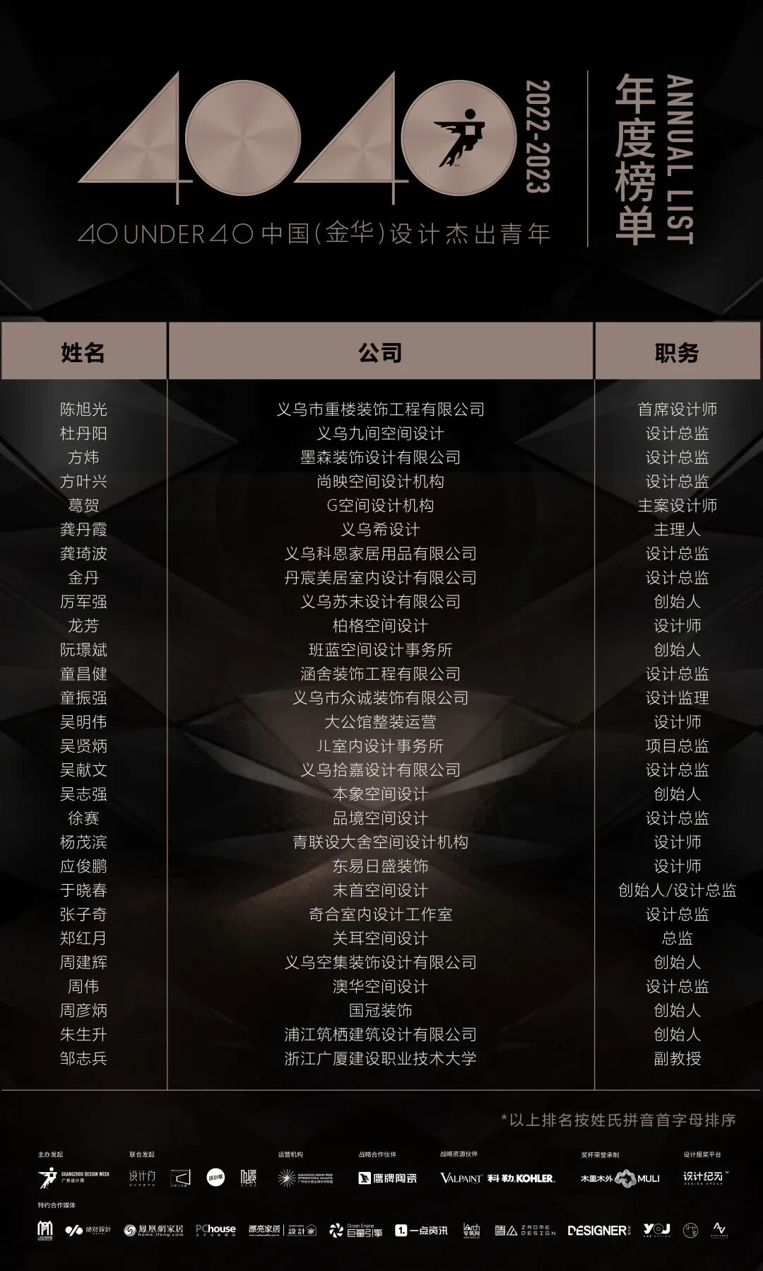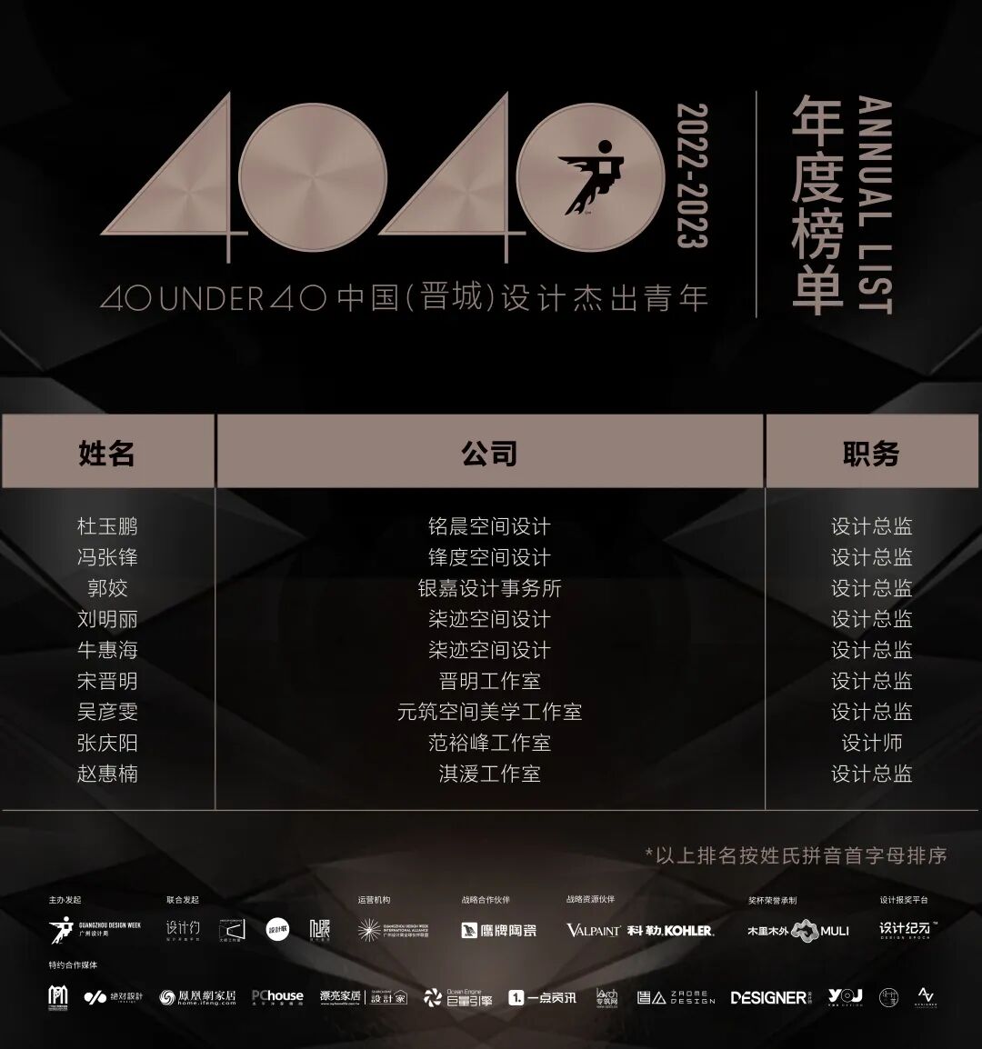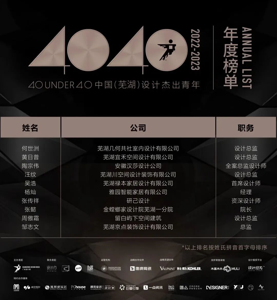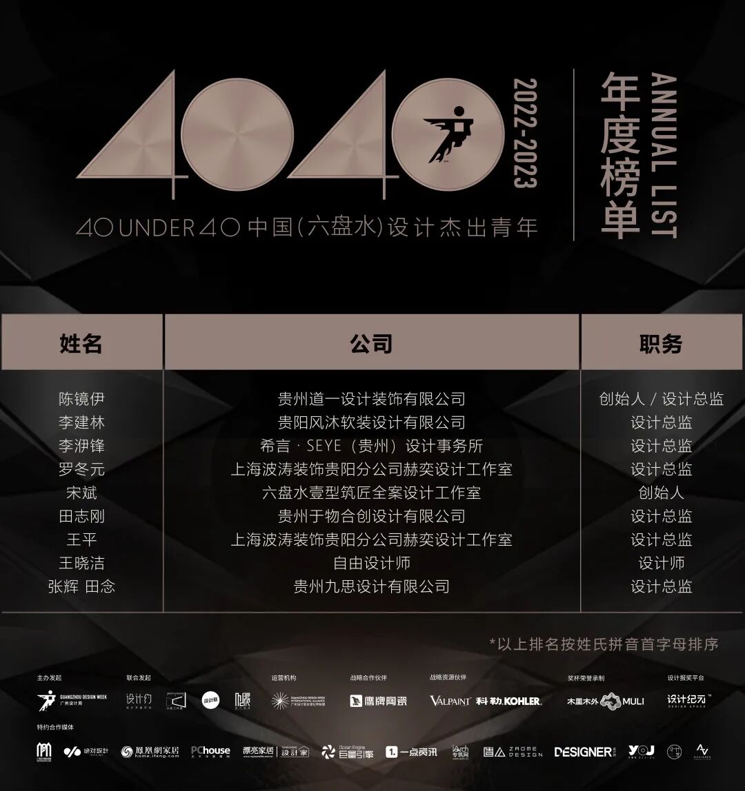 “40 UNDER 40中国设计杰出青年”年度榜单由广州设计周在IFI认证、全球同步推广的专业背景下于2016年发起,每年度通过举办“城市榜、省区榜、全国榜”等核心内容,发布并表彰城市/省区/全国不超过40位40岁(含)以下在室内设计、建筑设计、园林景观设计及关联领域具有卓越表现和专业成就的青年设计师,旨在推动中国设计中坚力量合力成长,彰显中国设计精彩纷呈的征途篇章。