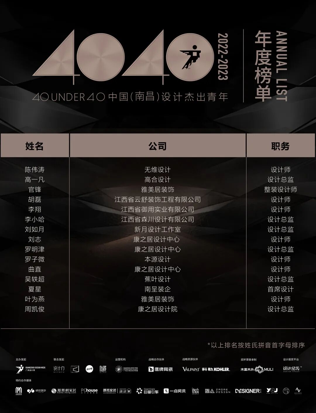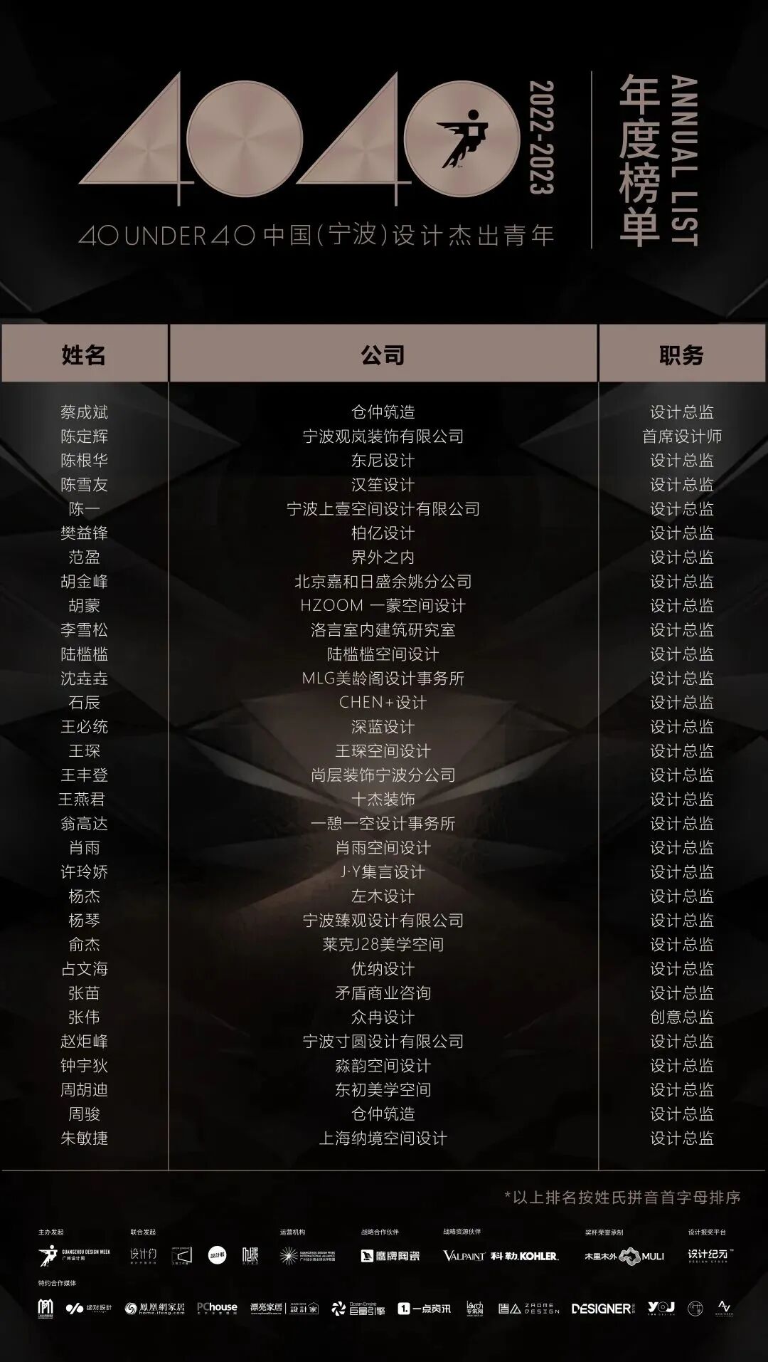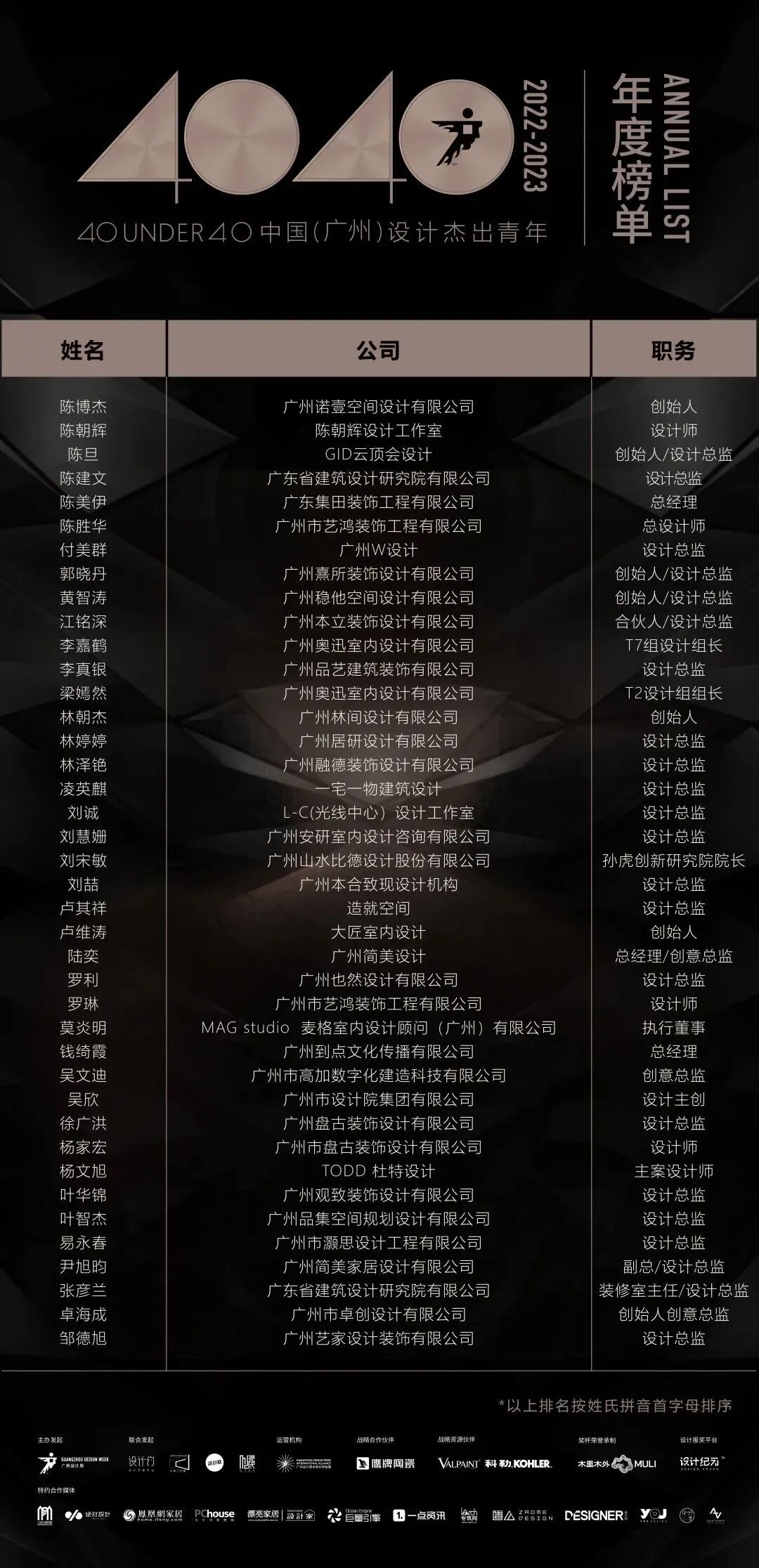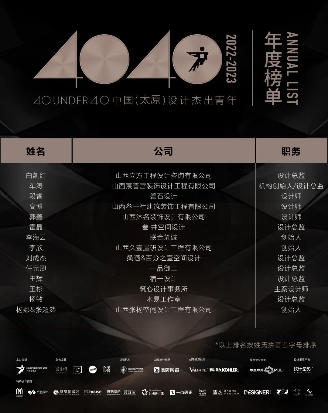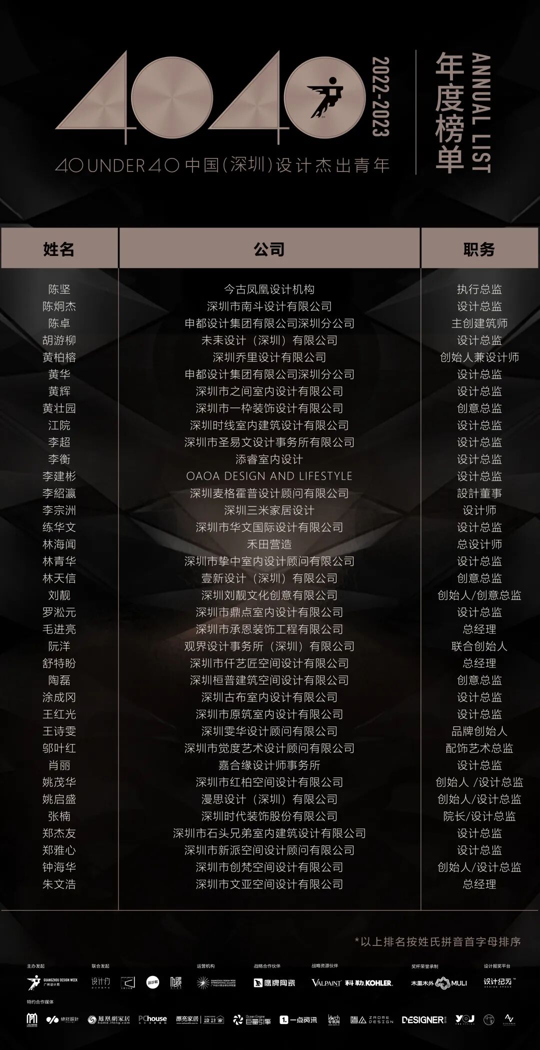 “40 UNDER 40中国设计杰出青年”年度榜单由广州设计周在IFI认证、全球同步推广的专业背景下于2016年发起,每年度通过举办“城市榜、省区榜、全国榜”等核心内容,发布并表彰城市/省区/全国不超过40位40岁(含)以下在室内设计、建筑设计、园林景观设计及关联领域具有卓越表现和专业成就的青年设计师,旨在推动中国设计中坚力量合力成长,彰显中国设计精彩纷呈的征途篇章。