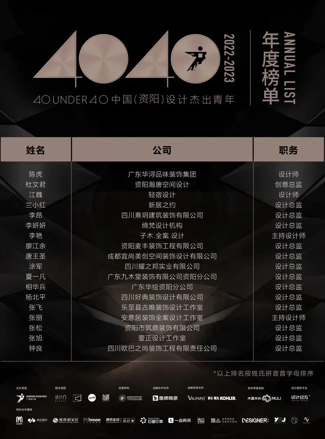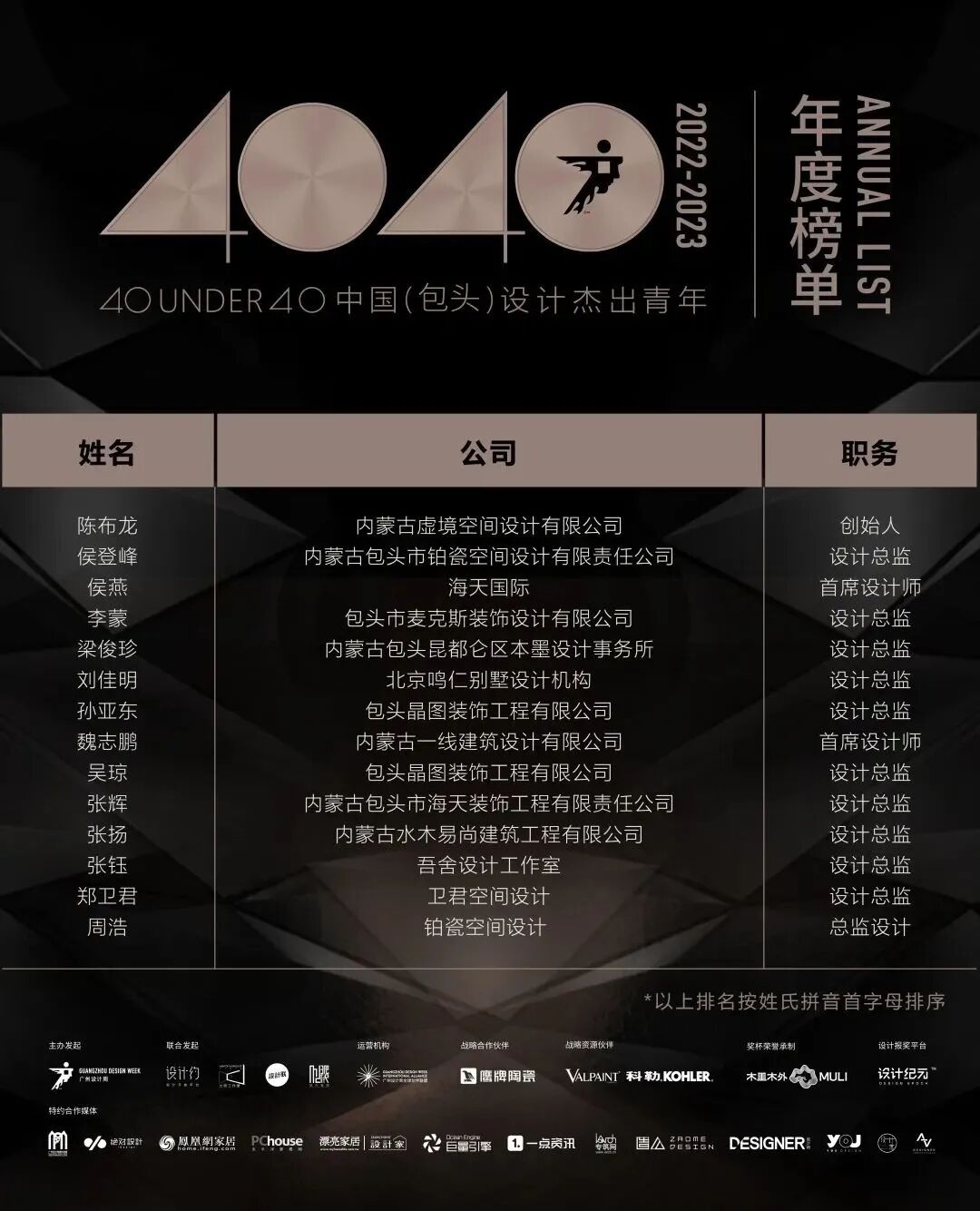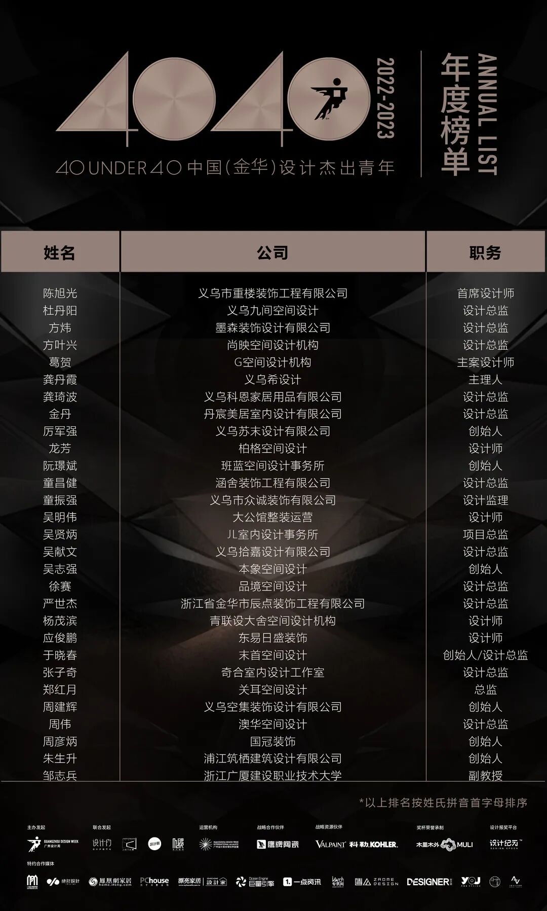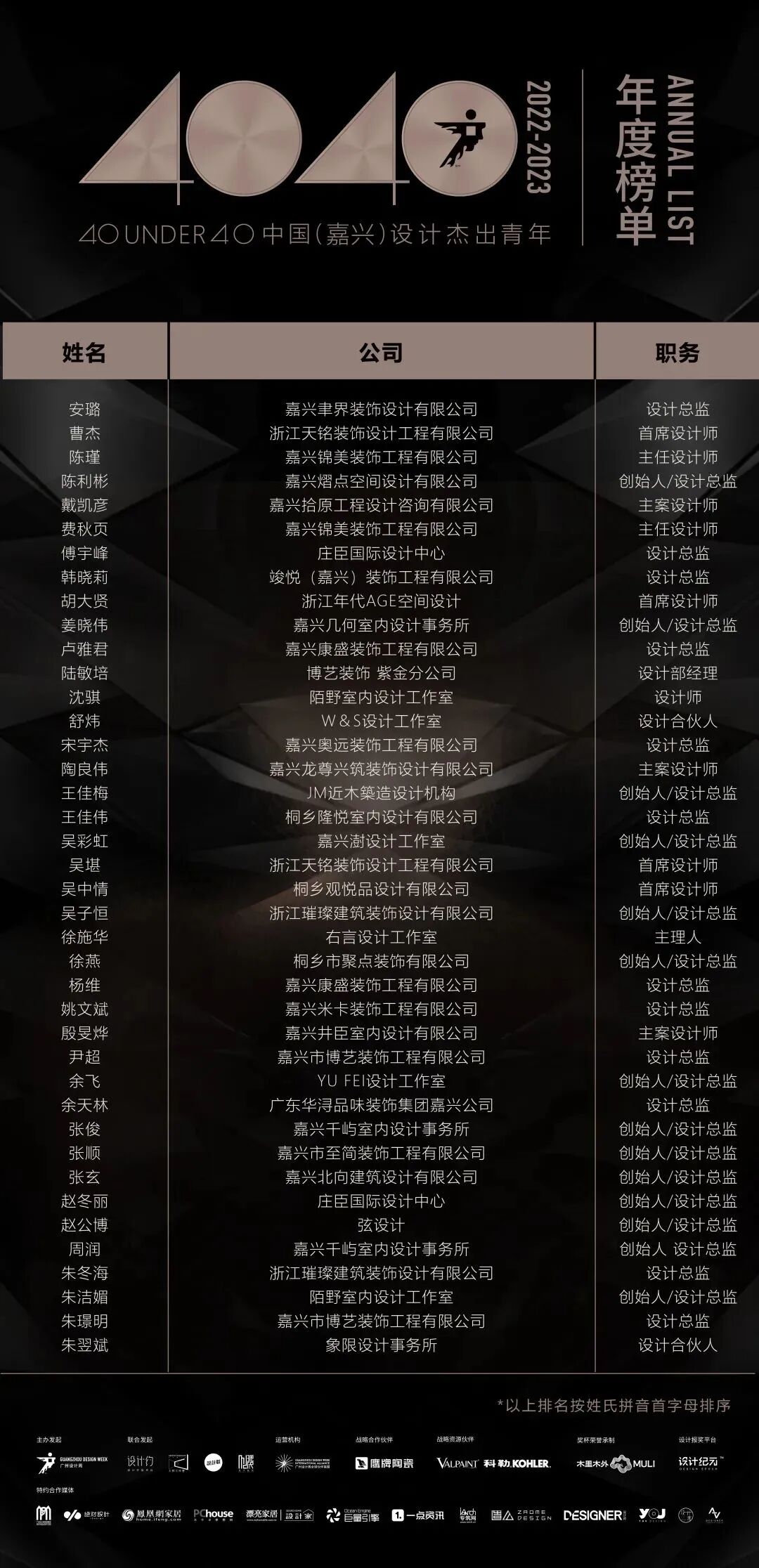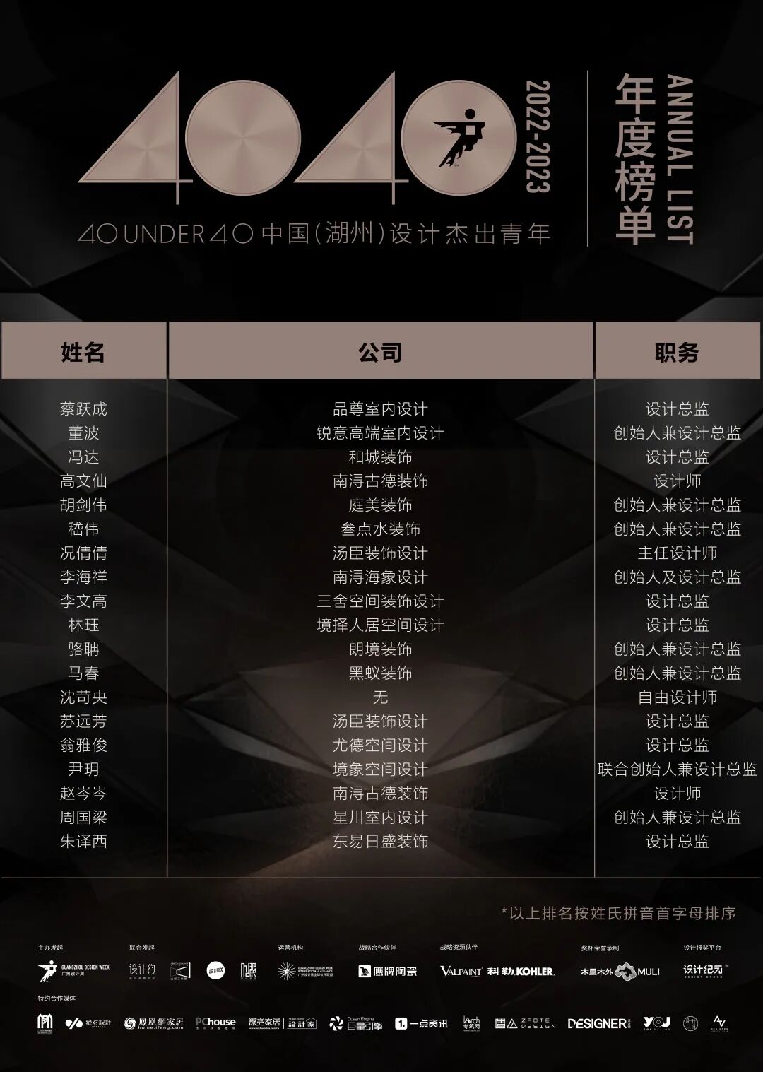 “40 UNDER 40中国设计杰出青年”年度榜单由广州设计周在IFI认证、全球同步推广的专业背景下于2016年发起,每年度通过举办“城市榜、省区榜、全国榜”等核心内容,发布并表彰城市/省区/全国不超过40位40岁(含)以下在室内设计、建筑设计、园林景观设计及关联领域具有卓越表现和专业成就的青年设计师,旨在推动中国设计中坚力量合力成长,彰显中国设计精彩纷呈的征途篇章。