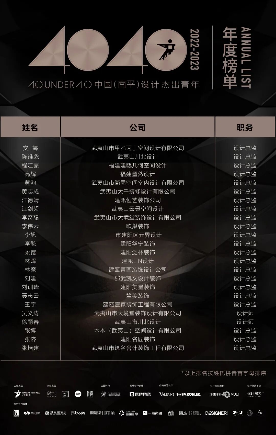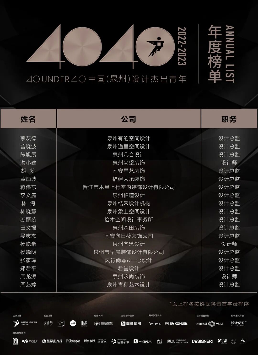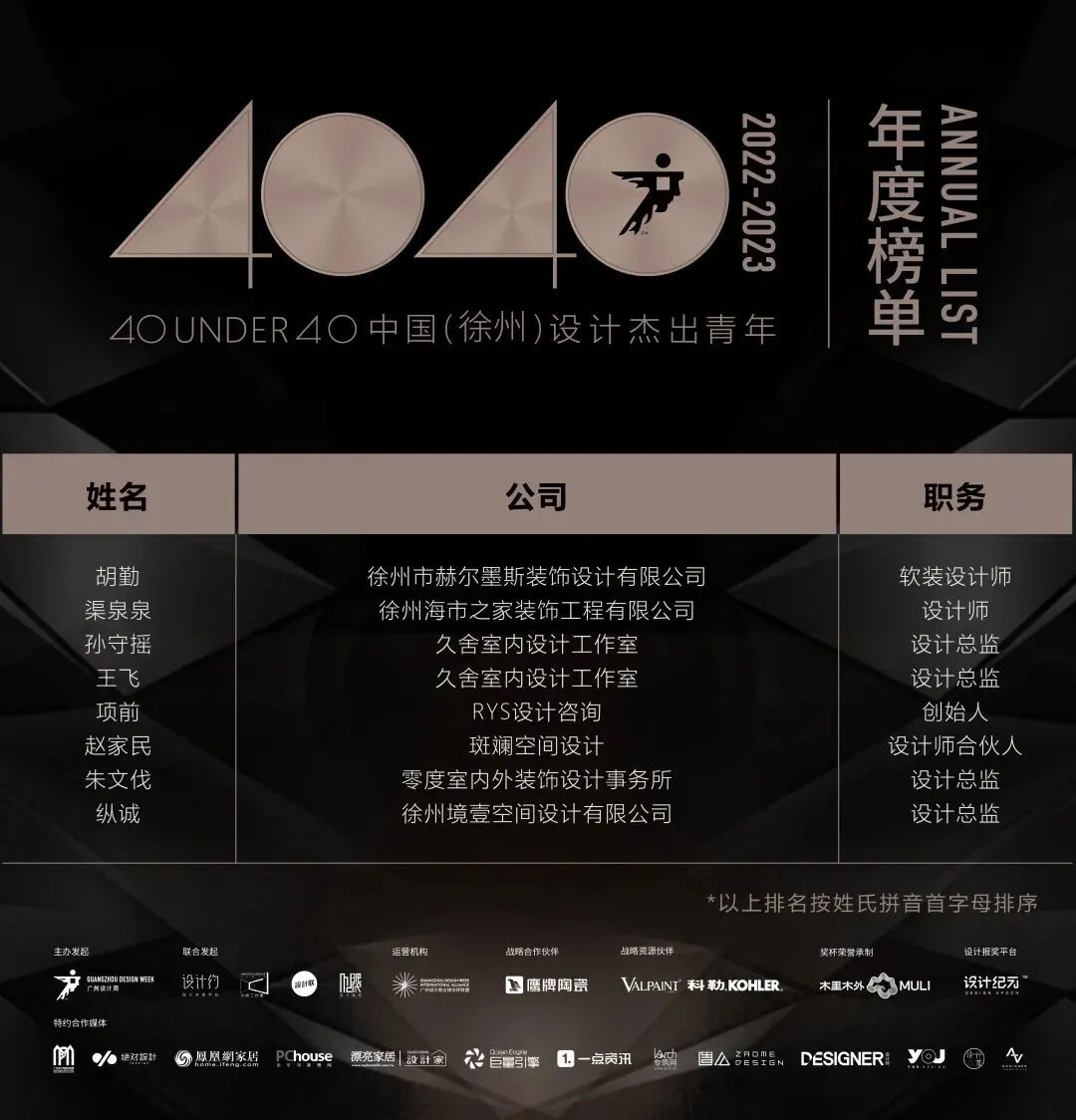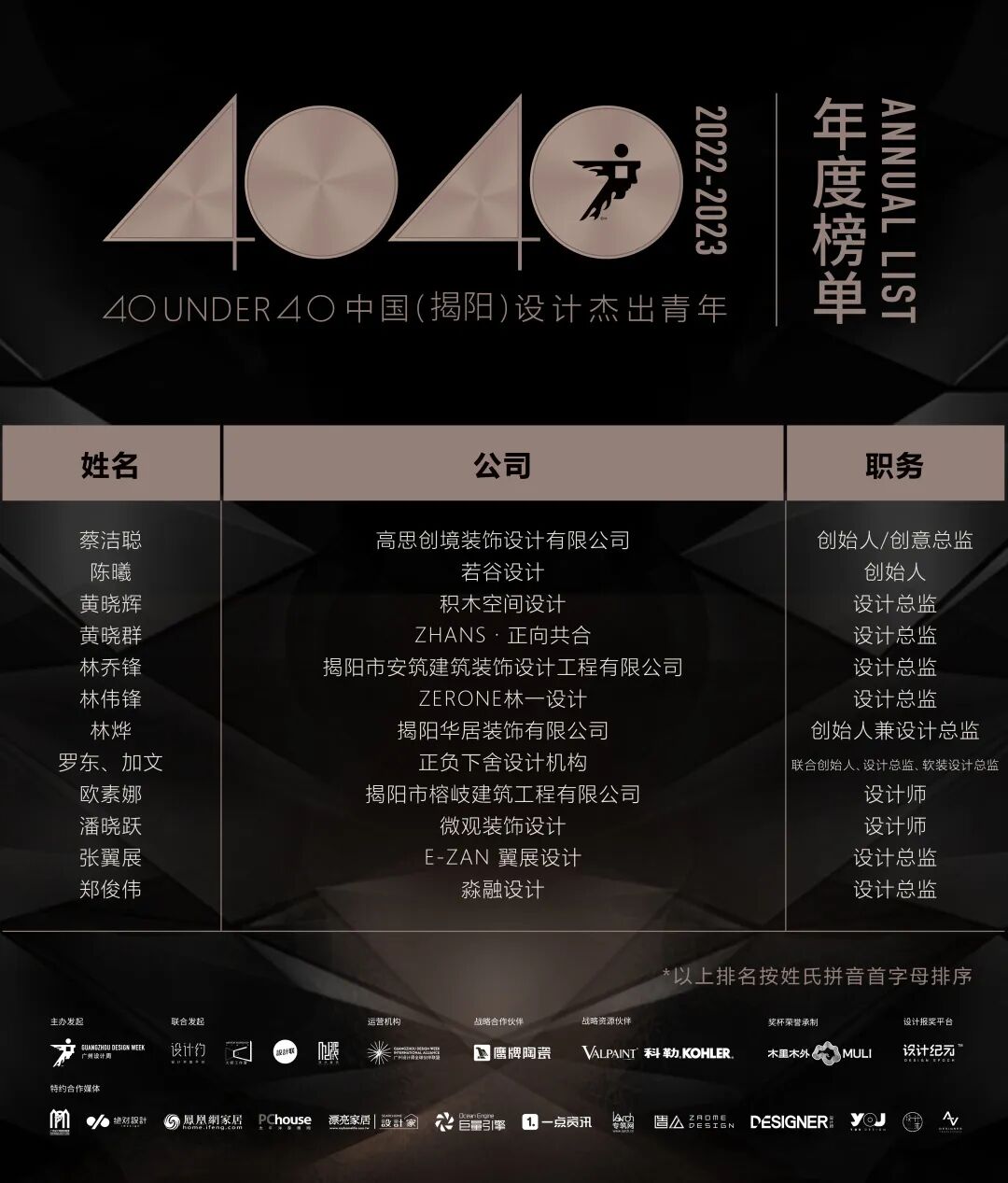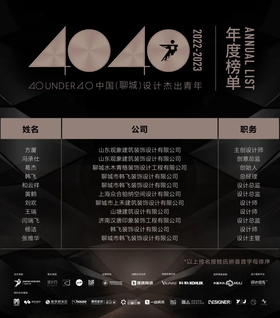 “40 UNDER 40中国设计杰出青年”年度榜单由广州设计周在IFI认证、全球同步推广的专业背景下于2016年发起,每年度通过举办“城市榜、省区榜、全国榜”等核心内容,发布并表彰城市/省区/全国不超过40位40岁(含)以下在室内设计、建筑设计、园林景观设计及关联领域具有卓越表现和专业成就的青年设计师,旨在推动中国设计中坚力量合力成长,彰显中国设计精彩纷呈的征途篇章。