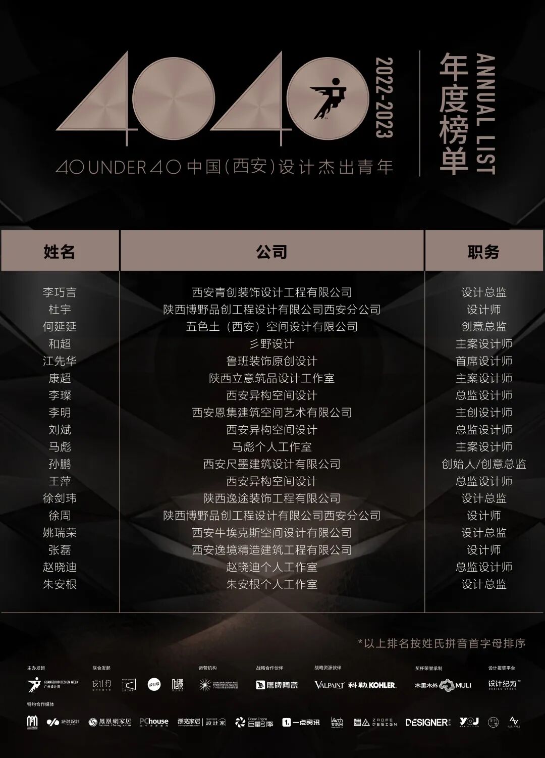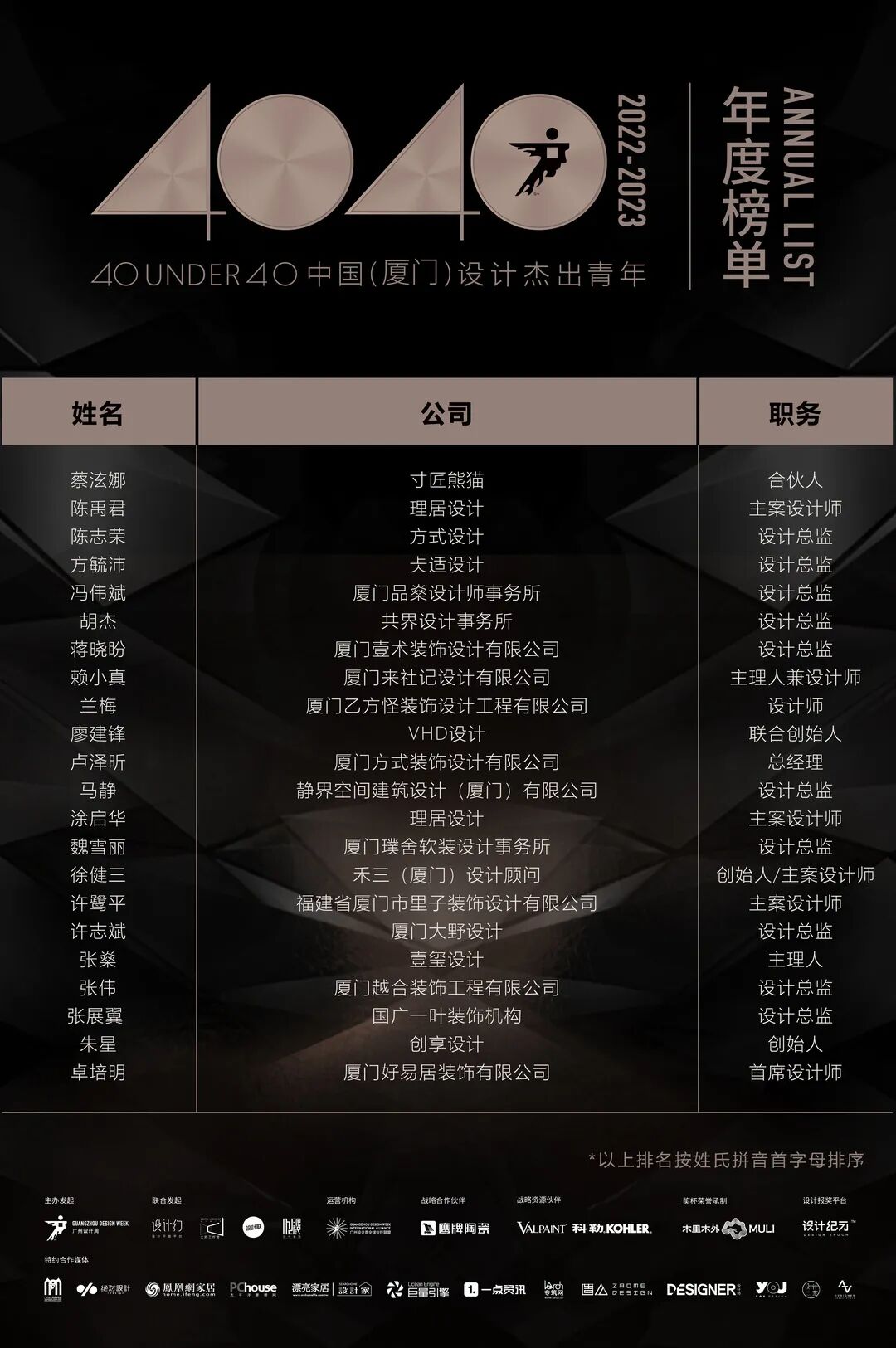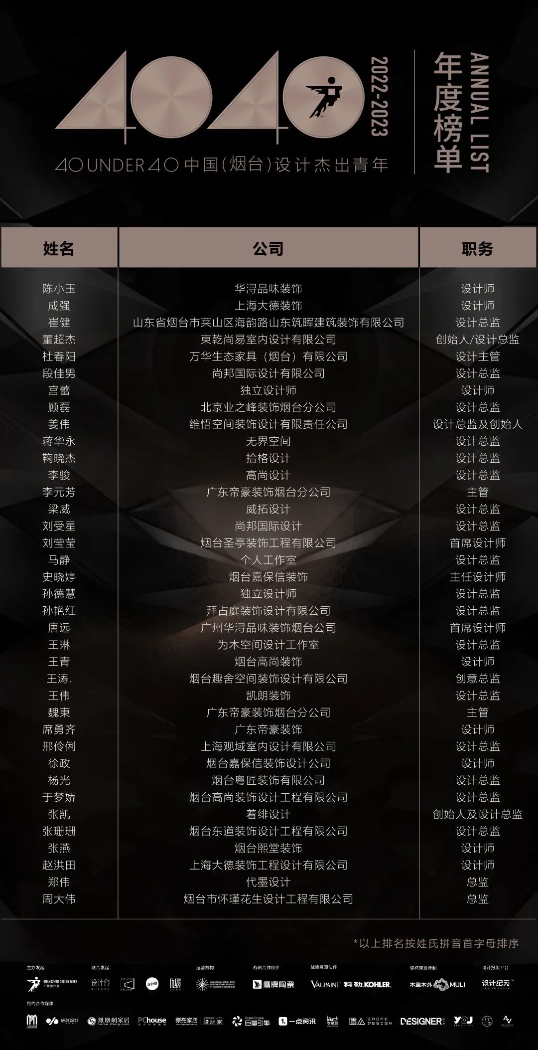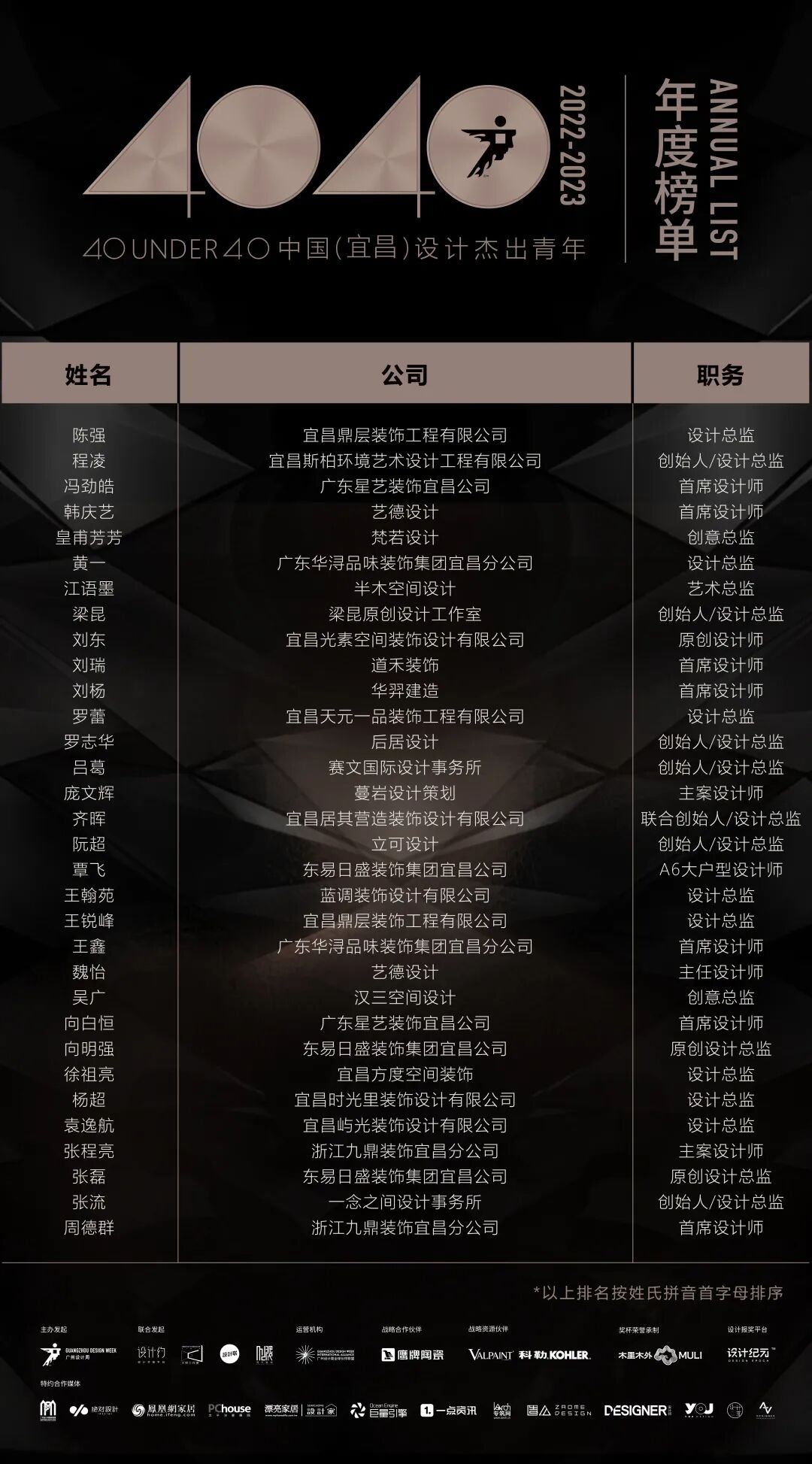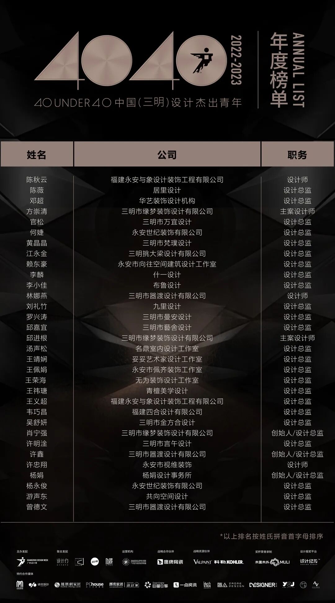 “40 UNDER 40中国设计杰出青年”年度榜单由广州设计周在IFI认证、全球同步推广的专业背景下于2016年发起,每年度通过举办“城市榜、省区榜、全国榜”等核心内容,发布并表彰城市/省区/全国不超过40位40岁(含)以下在室内设计、建筑设计、园林景观设计及关联领域具有卓越表现和专业成就的青年设计师,旨在推动中国设计中坚力量合力成长,彰显中国设计精彩纷呈的征途篇章。