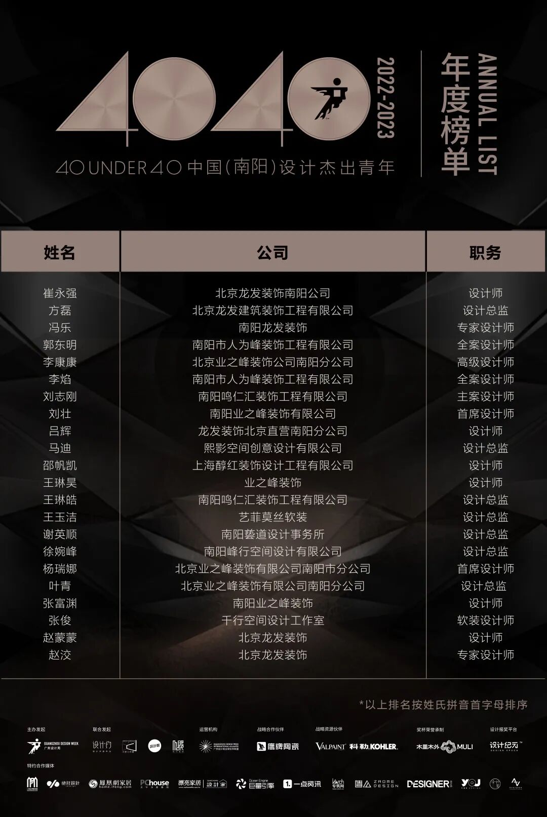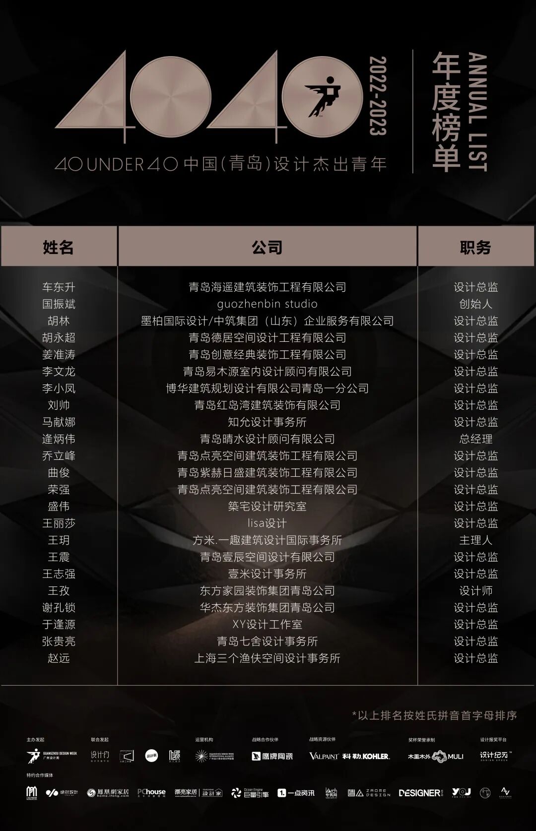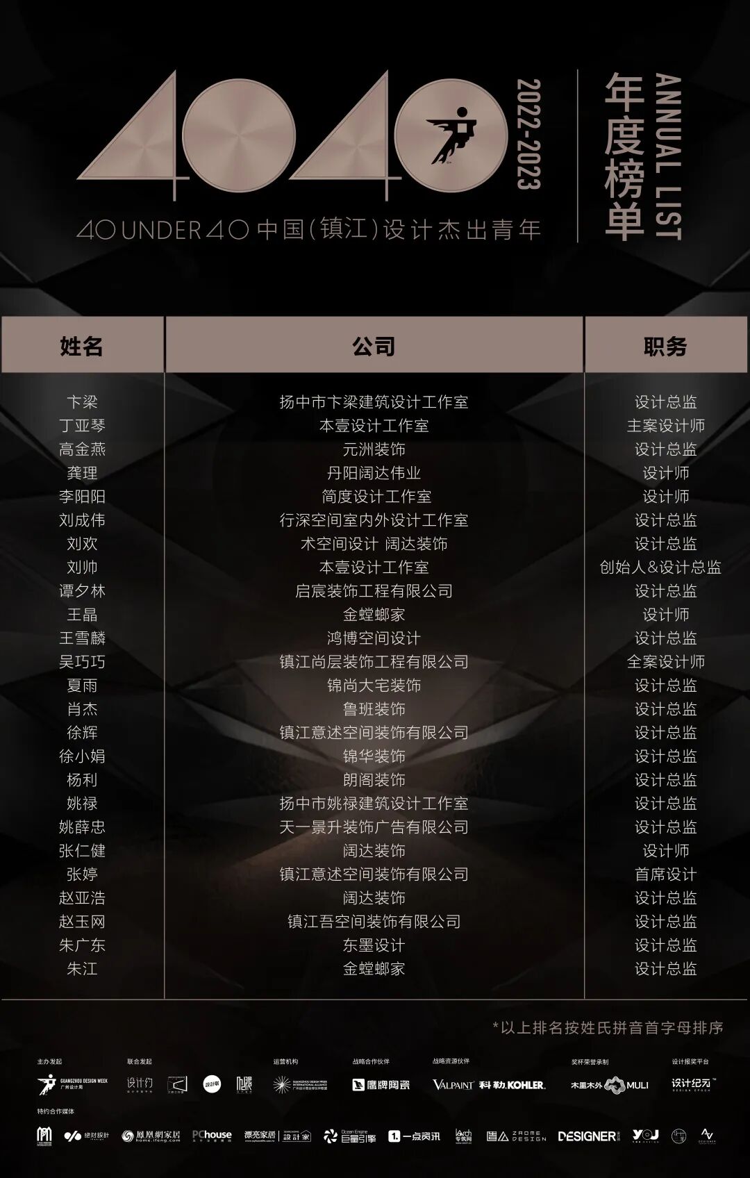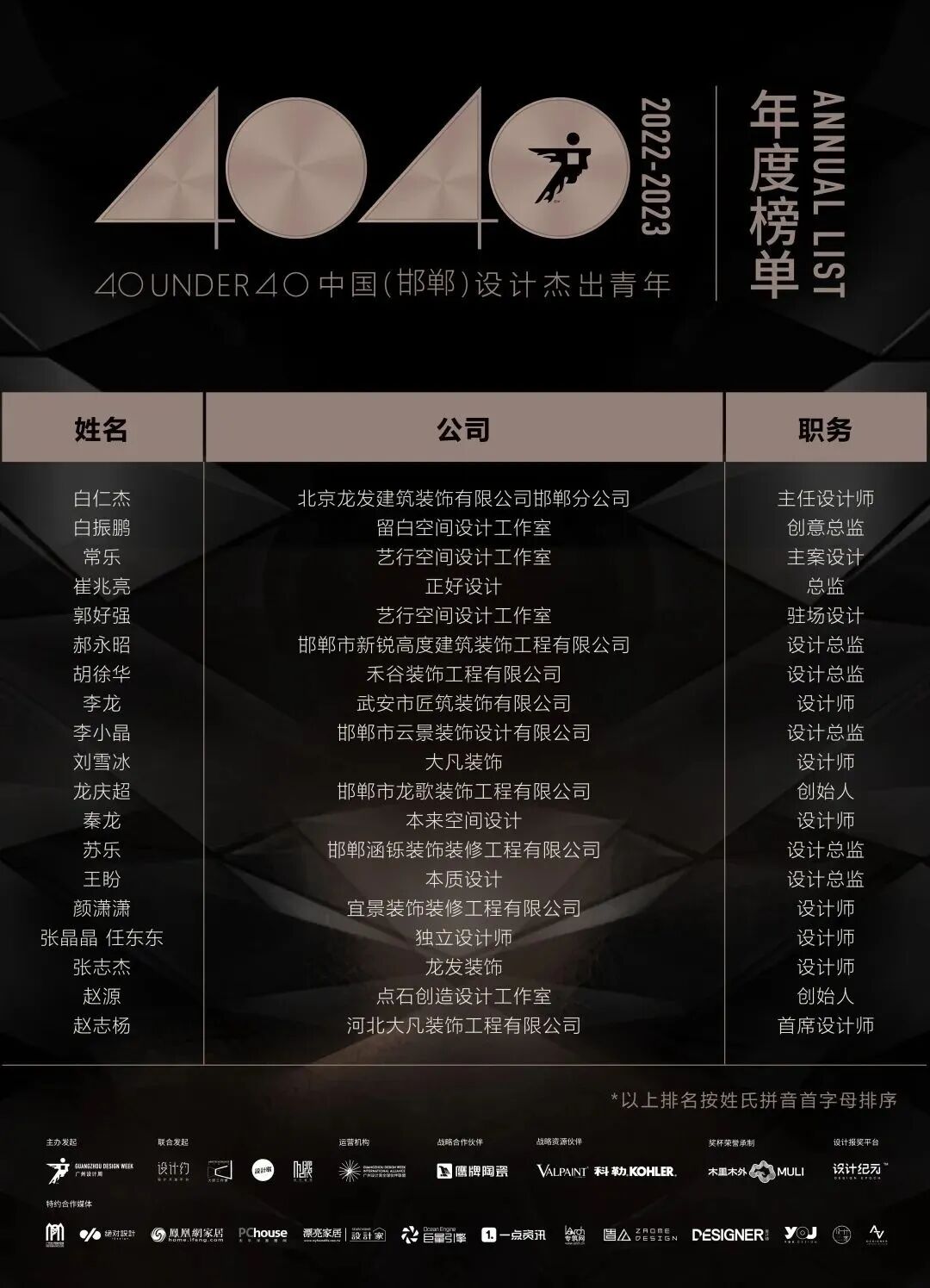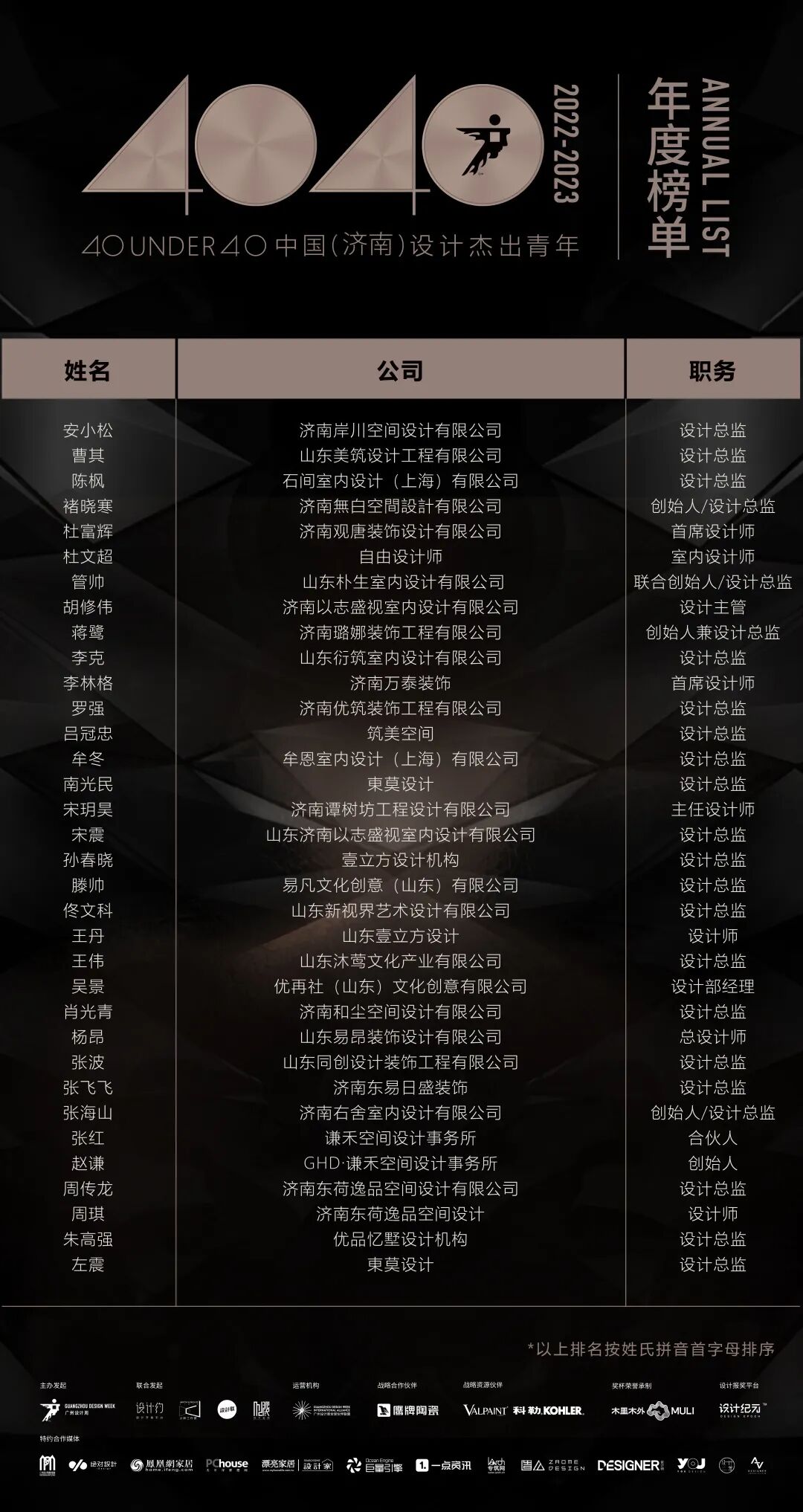 “40 UNDER 40中国设计杰出青年”年度榜单由广州设计周在IFI认证、全球同步推广的专业背景下于2016年发起,每年度通过举办“城市榜、省区榜、全国榜”等核心内容,发布并表彰城市/省区/全国不超过40位40岁(含)以下在室内设计、建筑设计、园林景观设计及关联领域具有卓越表现和专业成就的青年设计师,旨在推动中国设计中坚力量合力成长,彰显中国设计精彩纷呈的征途篇章。