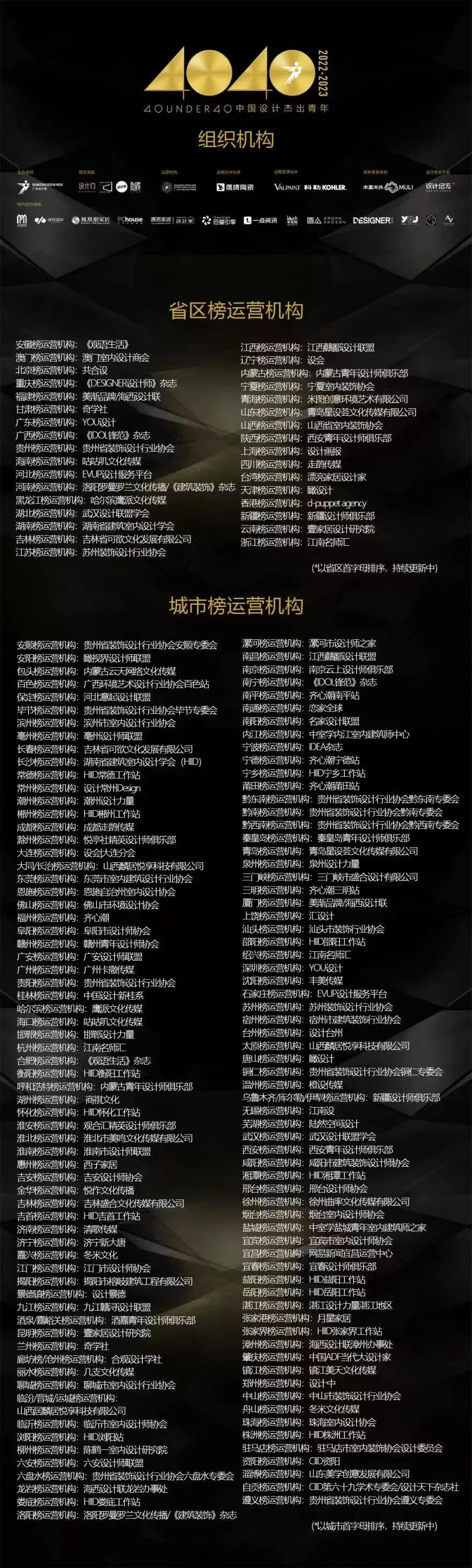 如果说中国的设计行业是一张大网,我们能够把握行业主动脉,但是960万平方公里的土地上万千优秀设计者的挖掘,是依凭「40 UNDER 40」30多个省区及城市运营机构,他们是这张行业大网下的各个毛细血管,是「40 UNDER 40」走向全国的基石。