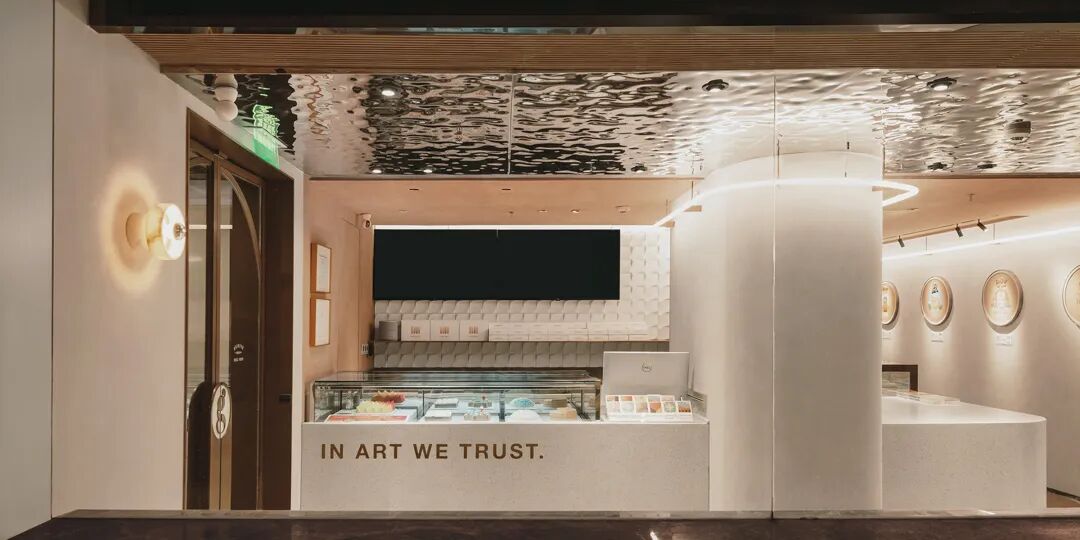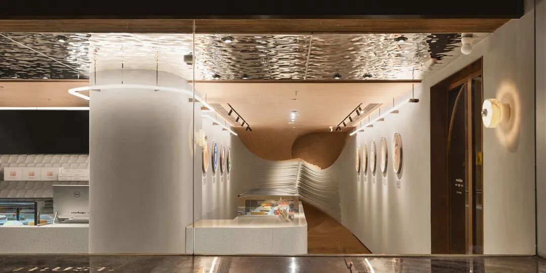 与产品开发思路保持一致,通过Rhion建模、3d立体打印,天地墙的端头形成了搅拌融合的面团;同时又保留其立方体的建筑体块,以体现一克甜品本身产品的特质。
