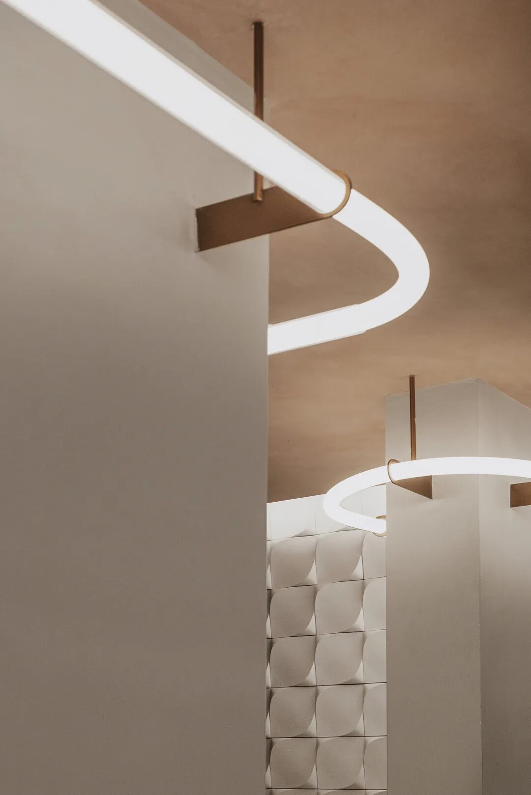 结合所在街区环境,室内采取了类似橱窗设计的呈现思路。取自榛子粉的颜色作为空间主基调,采用顶部灯条已强化空间形态与光效,以最简单的构成完成内部的主要视觉效果。