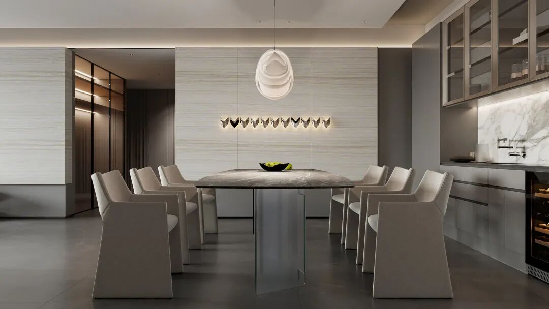从材质的触感到细节的勾勒,体现出对女性与儿童的关系;局部反射的天花,模糊空间层高的局限,照明设计的光线安排让室内氛围更为柔和。
