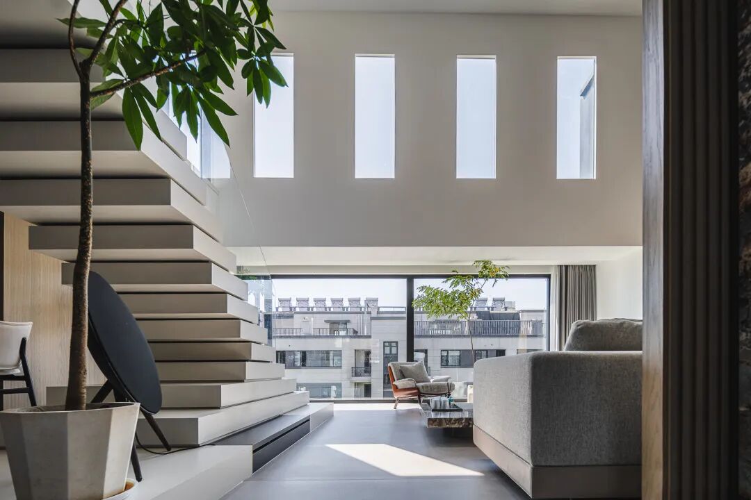 客厅最显眼的就是楼梯了,我们选用了钢构的基础,楼梯面我们做的是哑光面的白色岩板,扶手用了一点二的超白玻璃,这样整个空间会更加的通透明亮。