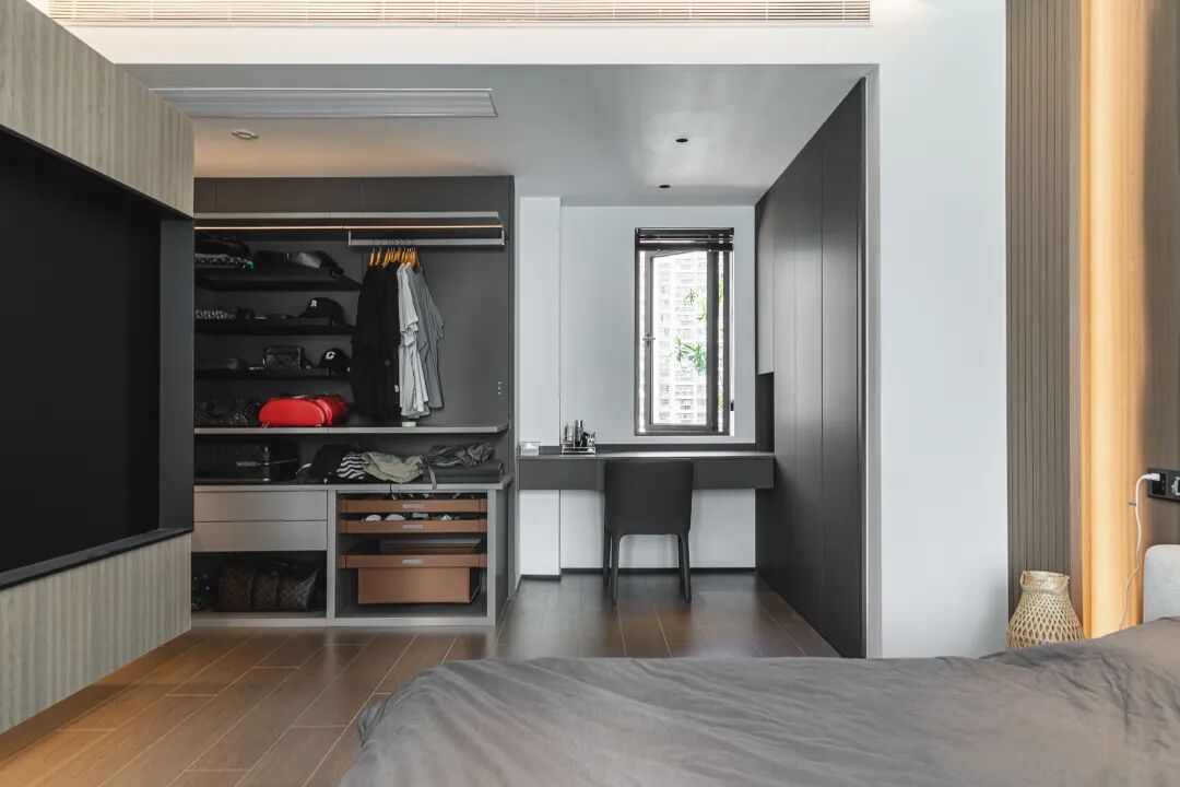 主卧设计了开放式的衣帽间,衣柜是没有竖板的,加大衣服的展示选取面积。主卧卫生间和房间一体,悬浮的电视背景,这样即能保证空间视角的放大,也能实现卫生间的隐私。