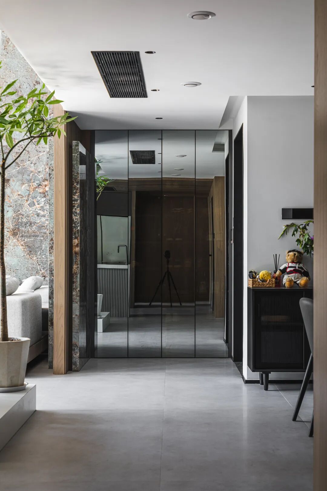 玄关区域用了单面镜面的鞋柜设计,打开柜门灯亮的情况我们可以看到内部的鞋子,关上的时候又可以把它当作一面出门的全身衣帽镜去使用。