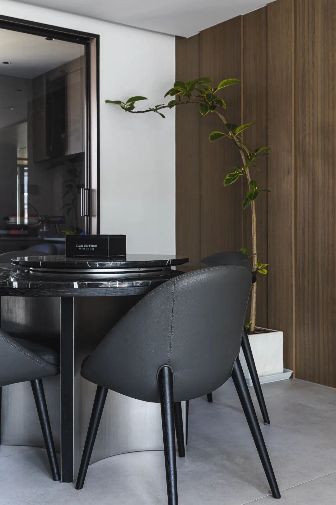 西厨的区域我们设计了一个两米多的岛台,还配备了水池和升降插座,并且放置了直饮机。中餐厅选用的是圆桌的设计,黑色的石材台面让空间更有格调。
