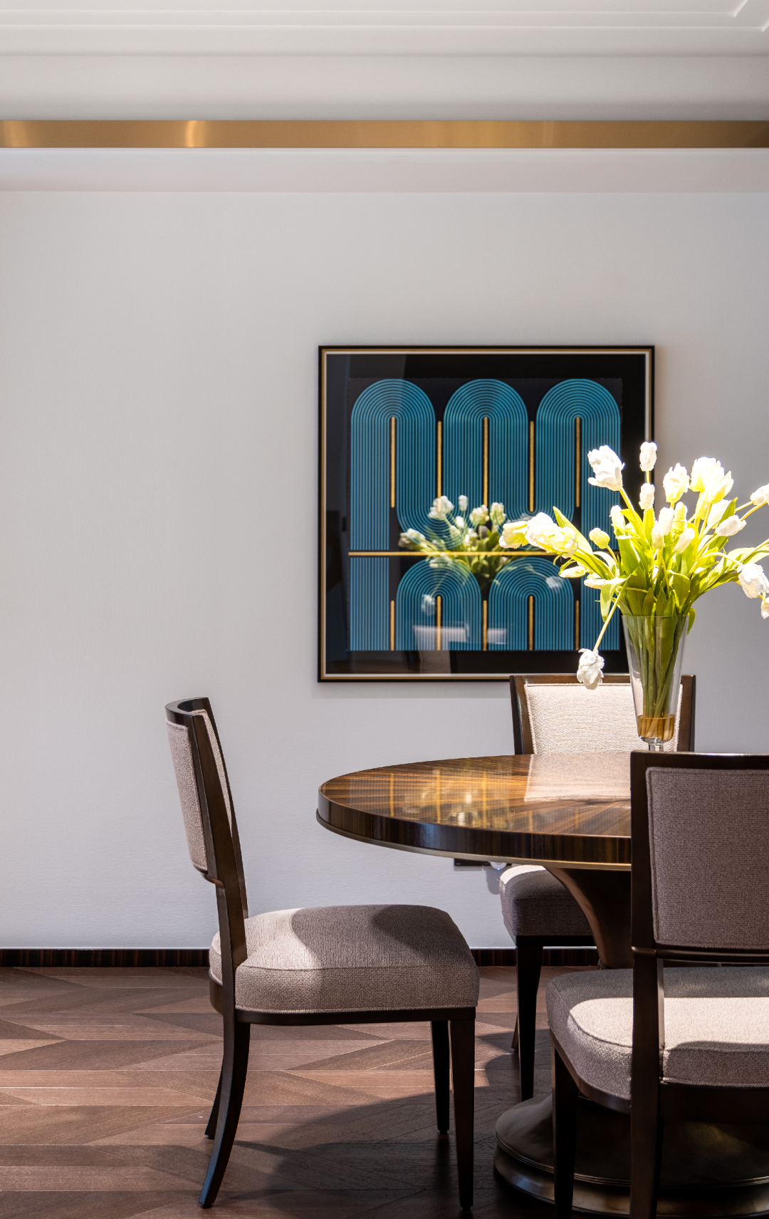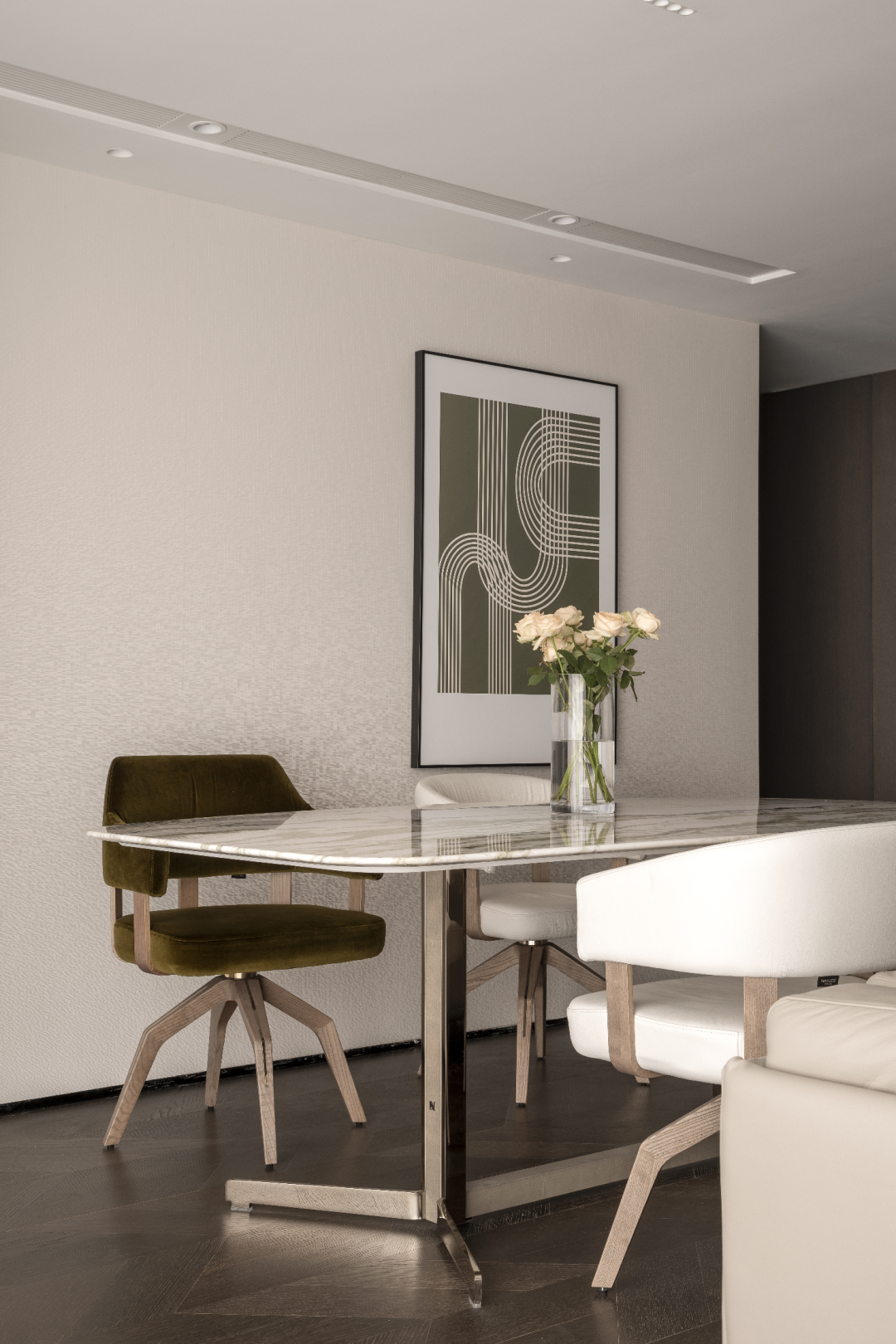 无论是设计还是生活本身,都离不开细节与品质的打磨。沙发背后,Campus餐桌和Valle chair静默而立,精致剪裁工艺之下,彰显着居者追寻精神悦己的生活态度。绿色线条装饰画点缀其间,安然纯净的气韵缓缓升华,浸润忙碌一生的心灵。