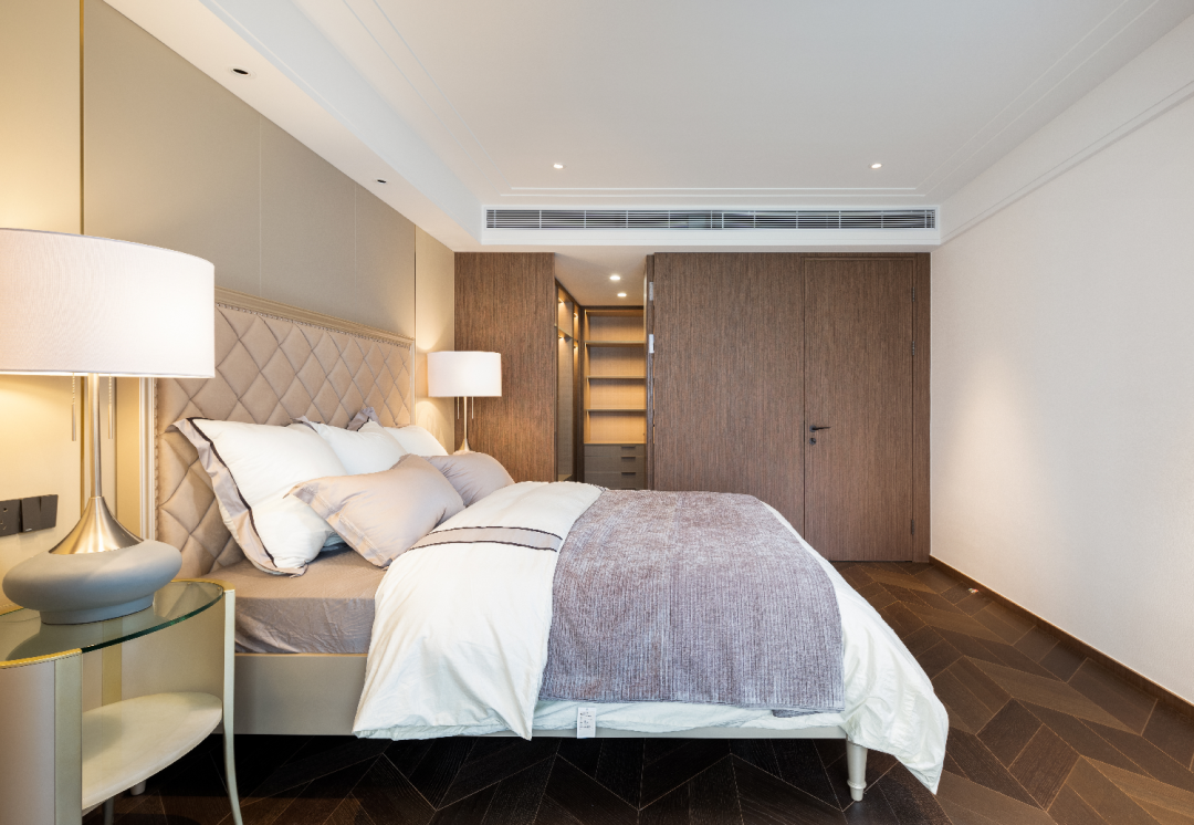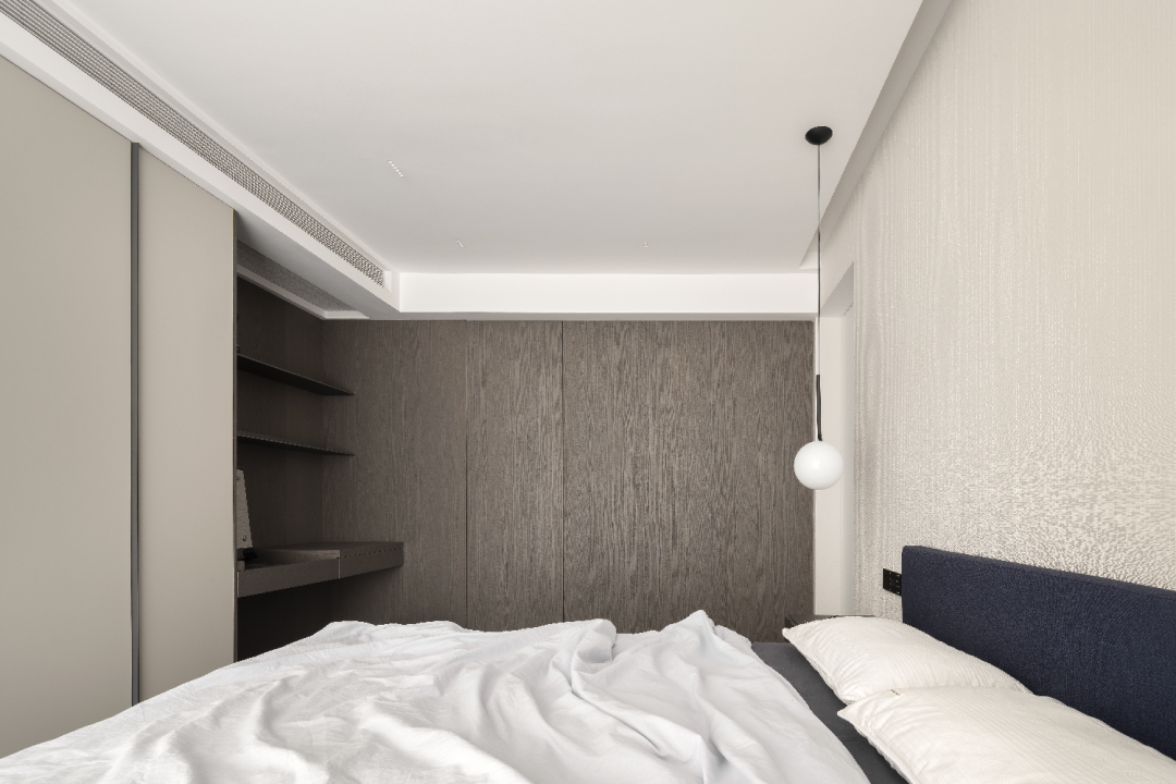双色硬包床背景镶嵌纤细的金属装饰条,呈现有变化却不过分突兀的视觉效果。设计师利用结构叠加衣帽间功能,原木色的木饰面在空间自然蔓延,从衣帽间到卫浴空间,静静释放着生活的气息。