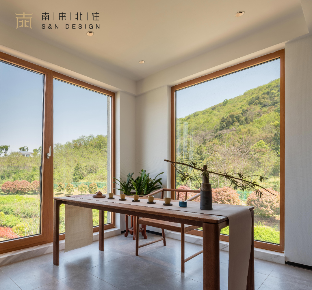 男主人热衷茶道,全景茶室是全屋的亮点之一。在这里,禅意与绿意糅合,俨然一处避世的心灵归所。身居茶室一隅,品茶悟道,避开尘世的喧嚣,与山林相拥,感受生活的丝丝诗意。