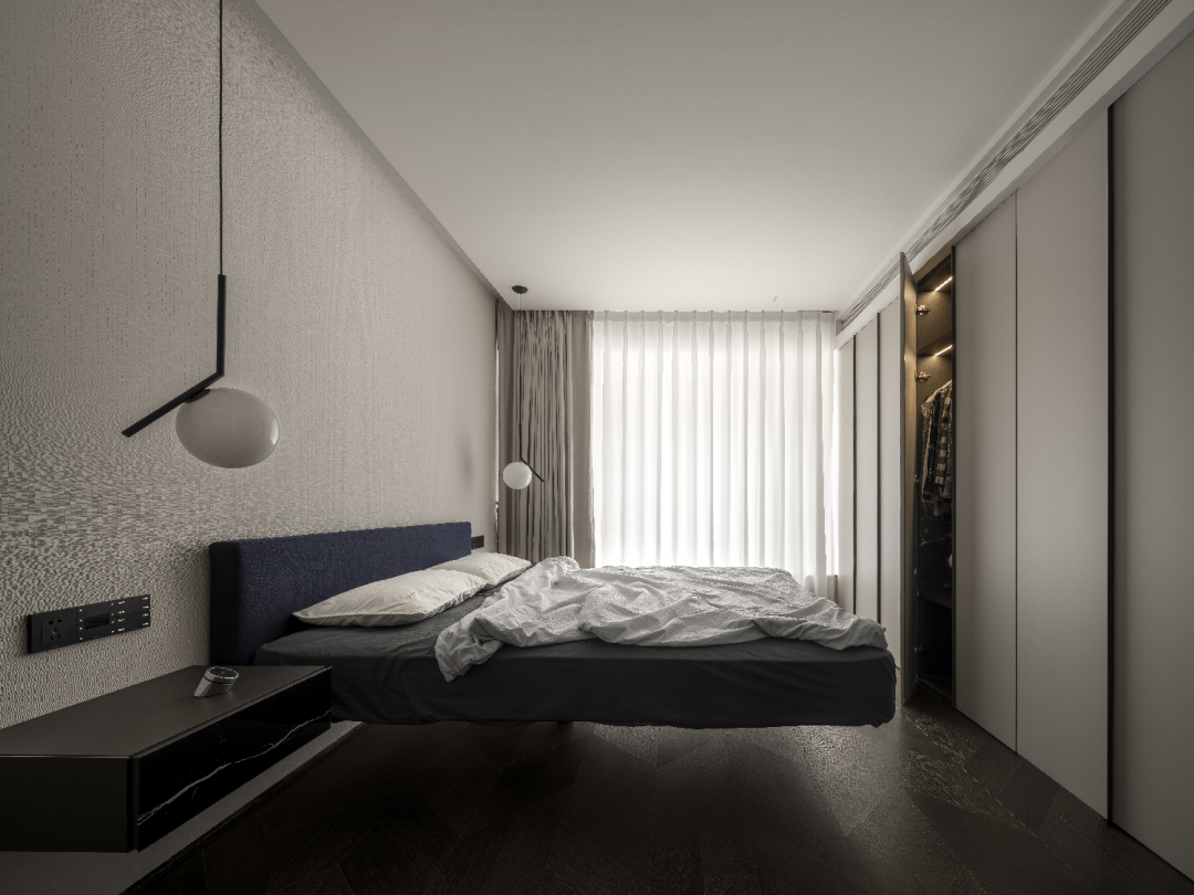 为契合居者的身份属性,设计师延续深邃内敛的主题直至主卧,极简的设计,体现“舒适”的家居内核,同时也将细节清晰地展露。深谙美学的FLOS吊灯完美还原满月高悬的诗意场景,自带“魔法”的LAGO悬浮床细数生活的极致梦幻。优雅的底蕴、诗意的氛围、极具个性的家居单品,无一不隐藏着对居者的贴心布局。