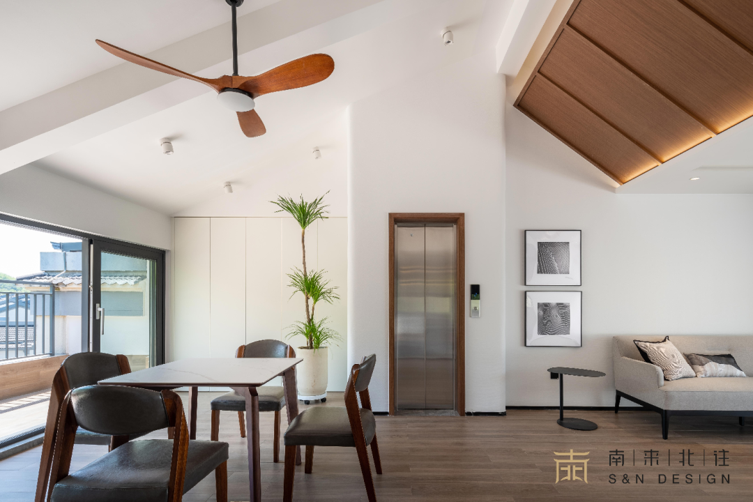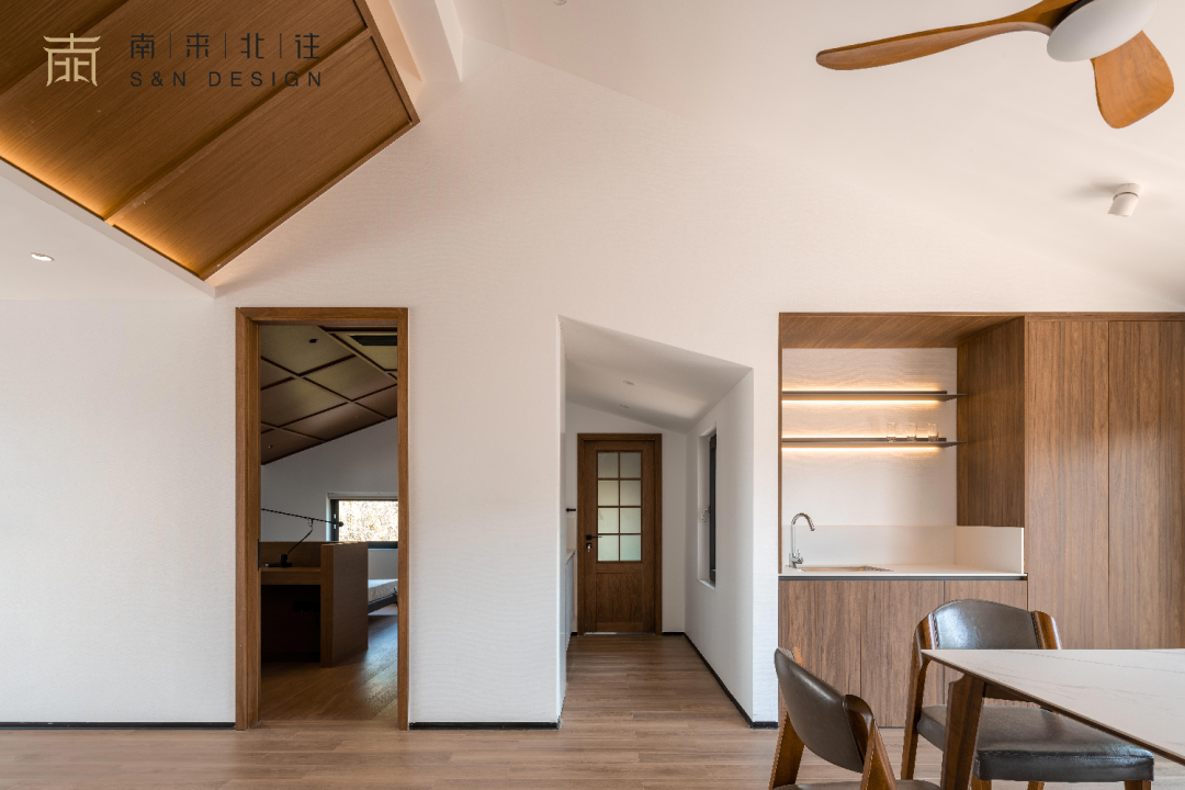 主材与家具的选择上,大多选用温润亲和的材质,顶面的风扇造型灯,温暖而质朴,相约三五好友,或是畅谈,或是牌聚,悠闲之境不言而喻。