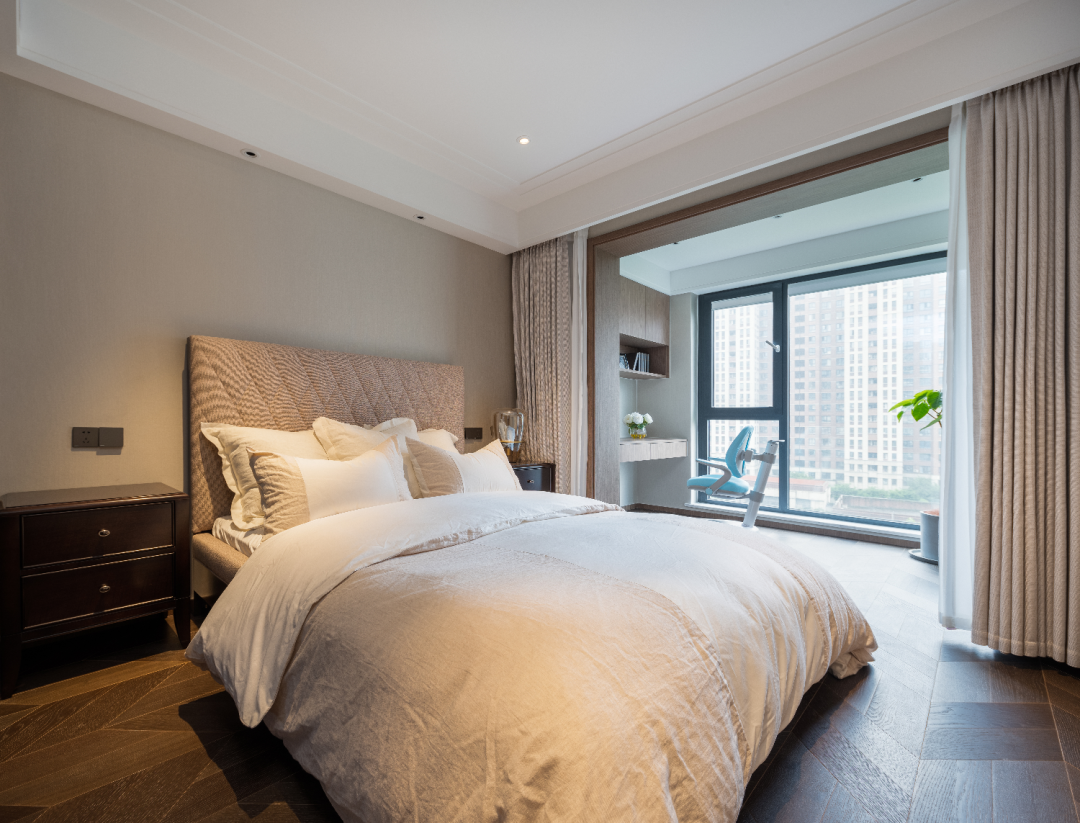 沿着意大利灰的踏步拾阶而上,是主卧套间和儿童房。主卧套间用色高雅,线条简洁,内里却满满的对生活的在意。阳台被改造成梳妆区兼书房,大大的窗户充分纳入夏夜的景致。