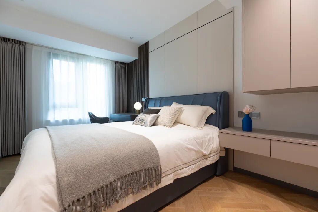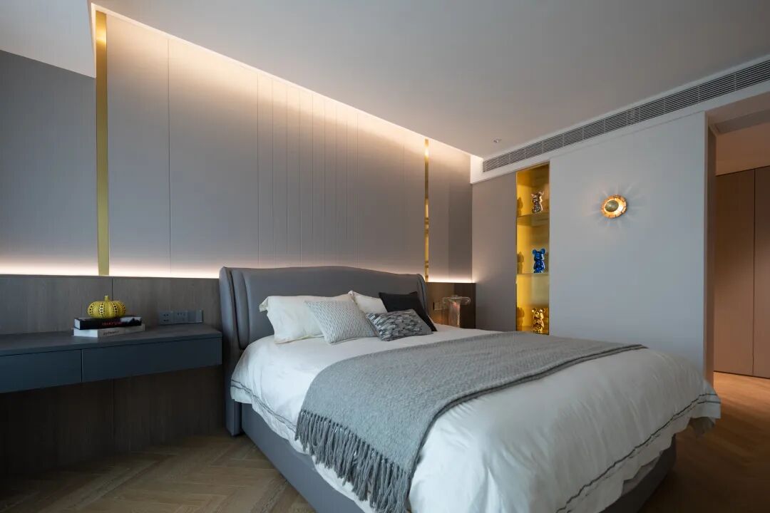 主卧与儿童房均采用温馨的色调,主卧硬包墙面与金属的光泽打造出独特的个性化气质。置物架也为男主人预留了手办的空间面,同时进行了主卧与衣帽间、书房、卫生间一体化的大套房设计,扩大了视觉面积,也充分考虑到住户的使用感。