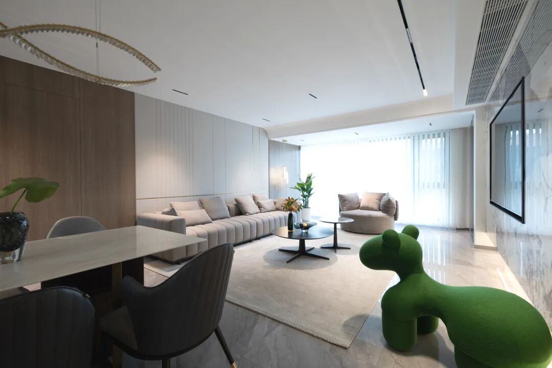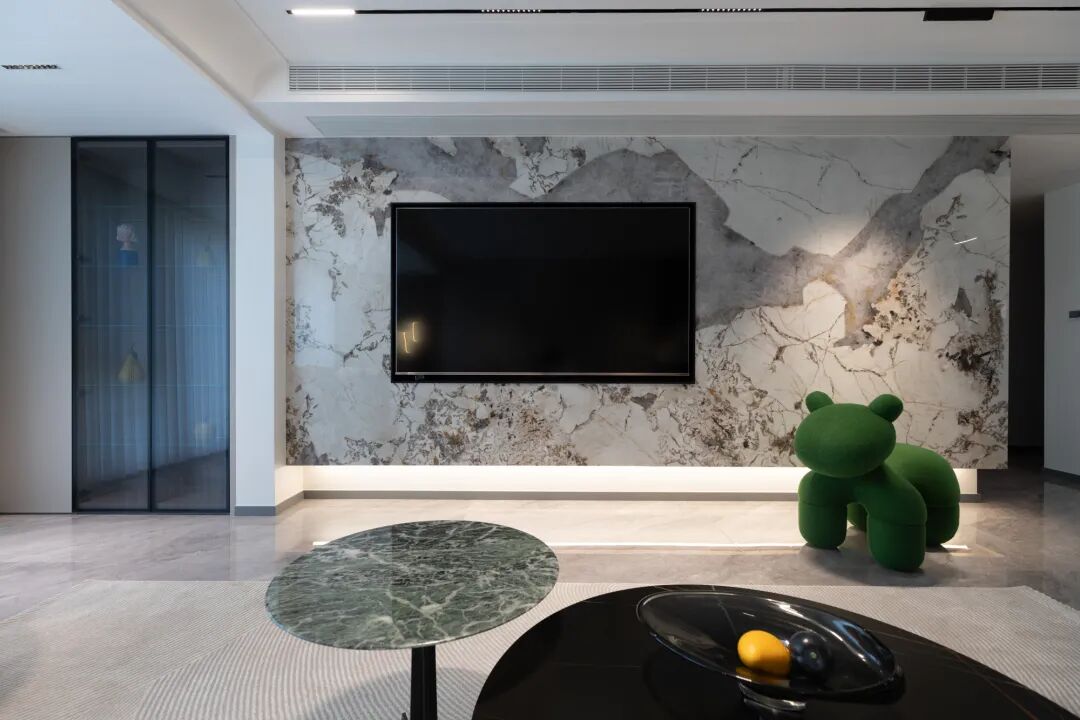 本案在设计的过程中打破了常规的思路,在空间轻奢的前提下又巧留了很多的储物空间。运用空间的巧妙性和多样性的色彩,赋予了房子独一无二的精致感。嵌入式电视机背景墙在内嵌灯光的烘托下凸显出氛围感,金属、板材及大理石完美融合,自然高端。