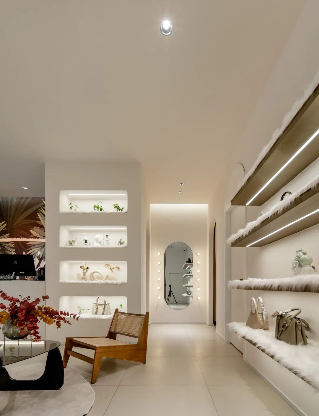 如何为客户引流,门头就很重要。三层内凹的设计,让空间划分出了橱窗区、打卡区、logo展示区,让原本单调的空间变得丰富起来。