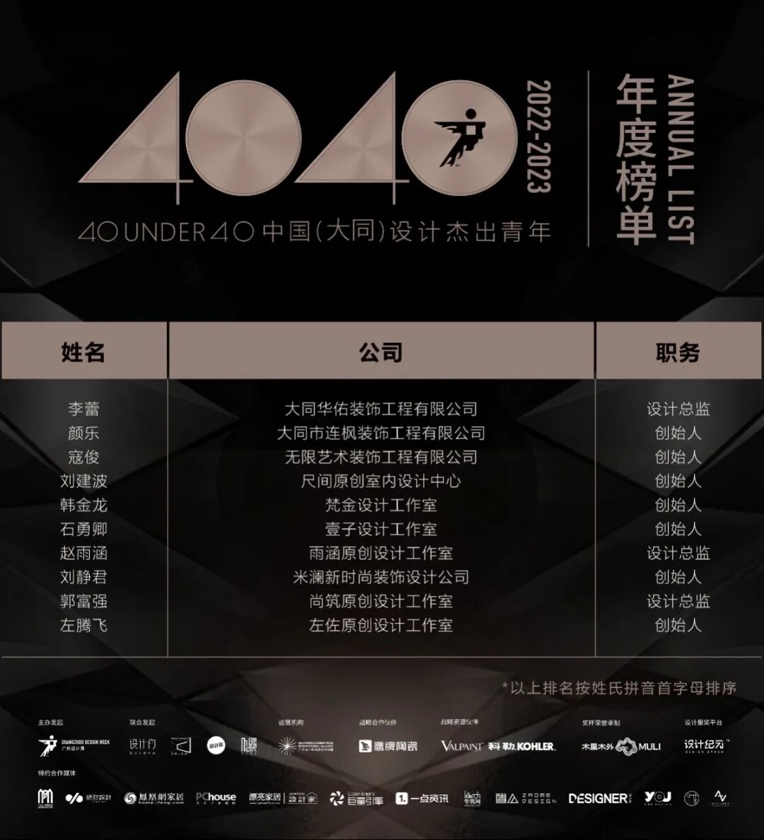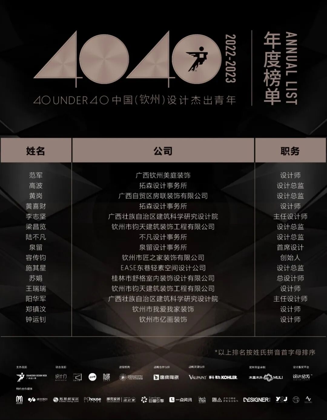 “40 UNDER 40中国设计杰出青年”年度榜单由广州设计周在IFI认证、全球同步推广的专业背景下于2016年发起,每年度通过举办“城市榜、省区榜、全国榜”等核心内容,发布并表彰城市/省区/全国不超过40位40岁(含)以下在室内设计、建筑设计、园林景观设计及关联领域具有卓越表现和专业成就的青年设计师,旨在推动中国设计中坚力量合力成长,彰显中国设计精彩纷呈的征途篇章。