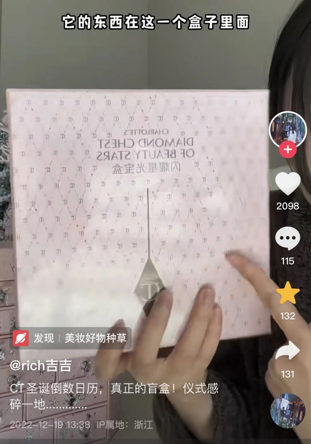 有博主另辟蹊径热衷“拆穿圣诞礼盒的消费主义陷阱”,@rich吉吉 直接拍摄了美妆品牌Charlotte Tilbury Beauty倒计时礼盒的包装和礼品分离的快递拆箱过程,一边拆一边吐槽“我的盲盒为什么和别人的不一样?” “完全没有惊喜感,就这?”
