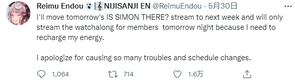 Reimu也有些怕了,发推表示将把会限以外的所有直播推迟到下一周。