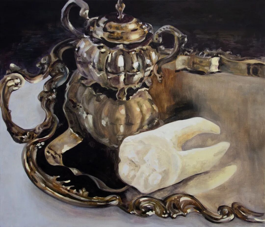 李珺,《托盘 贰》,2022,布面油画,60 x 70 cm,图片致谢艺术家与RED·MOON艺术平台