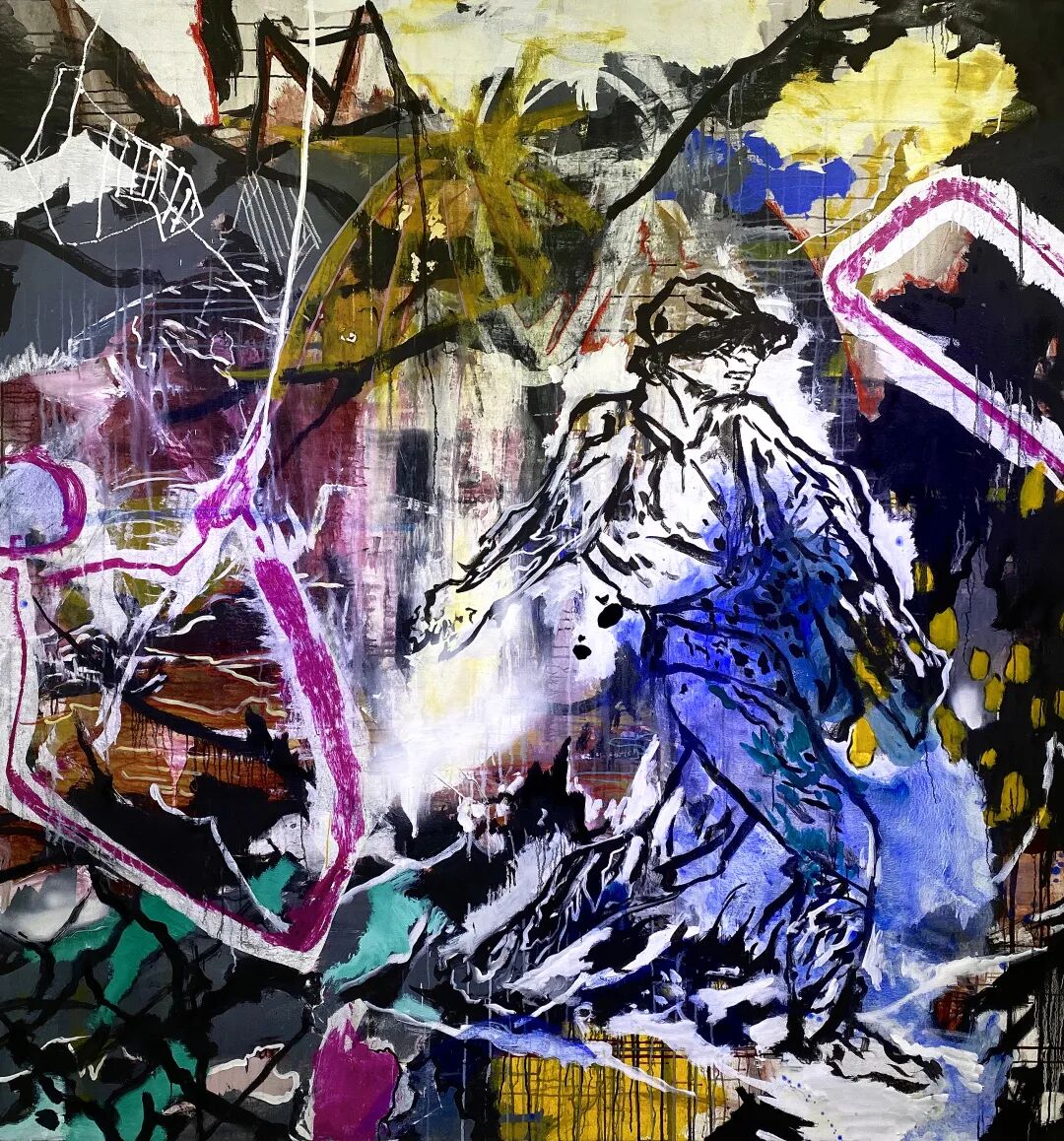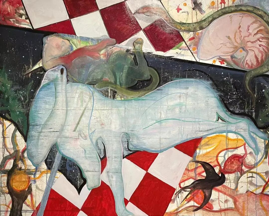 郑卓迦,《一颗种子的梦2》,2021-2022,布面亚克力、综合材料,200 x 180 cm图片致谢艺术家与仚東堂