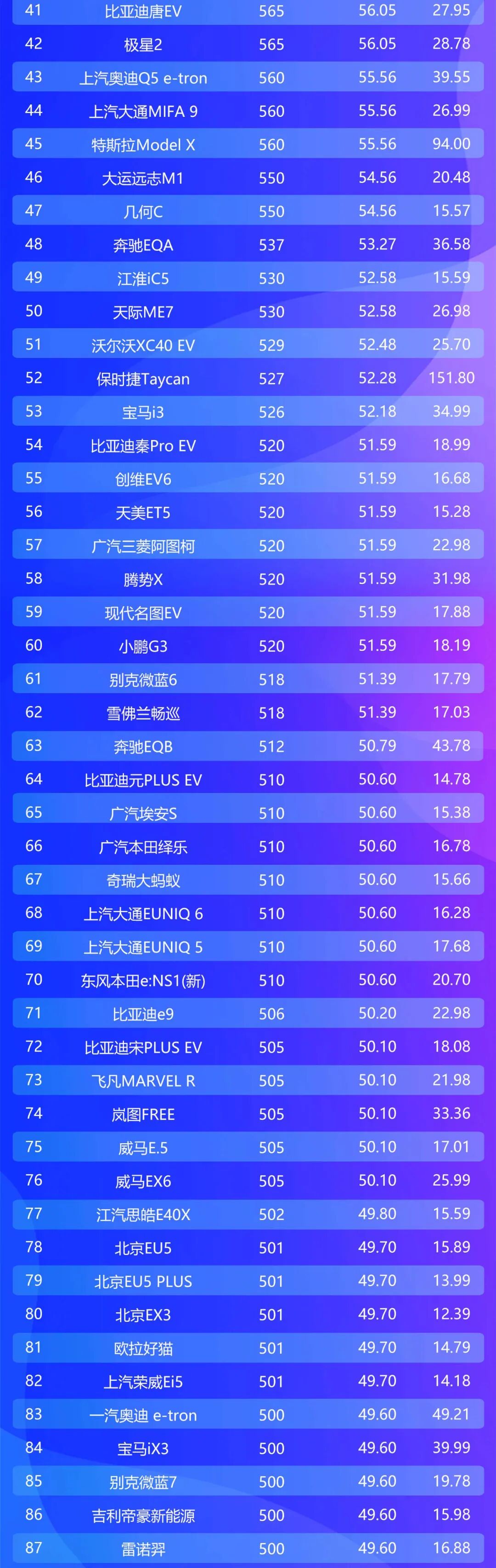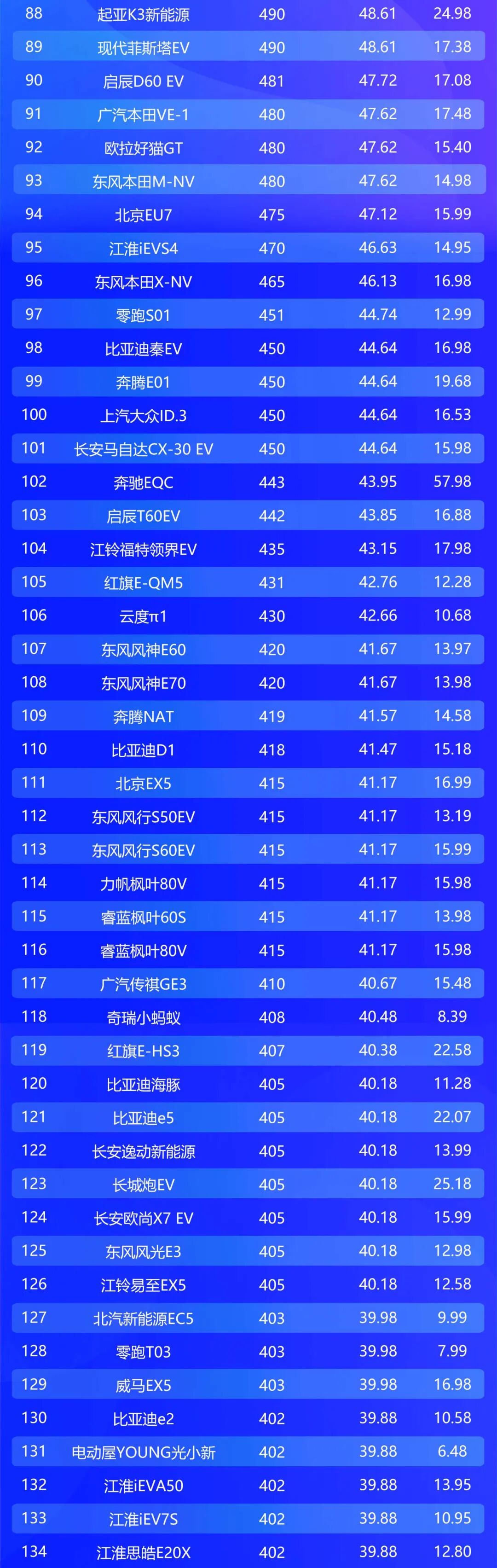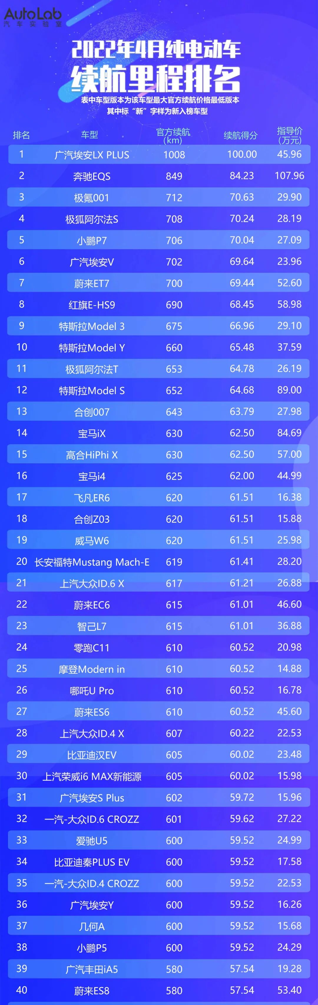 需要注意的是,本次榜单统计的为“官方续航”,其中续航标准采用的是NEDC以及CLTC,但由于采用CLTC标准续航的车型较少,目前仅有广汽AION LX PLUS、特斯拉Model 3、奔驰EQS、奔驰EQA等。未来采用CLTC标准的车型增加后,我们将会更新全新的榜单。