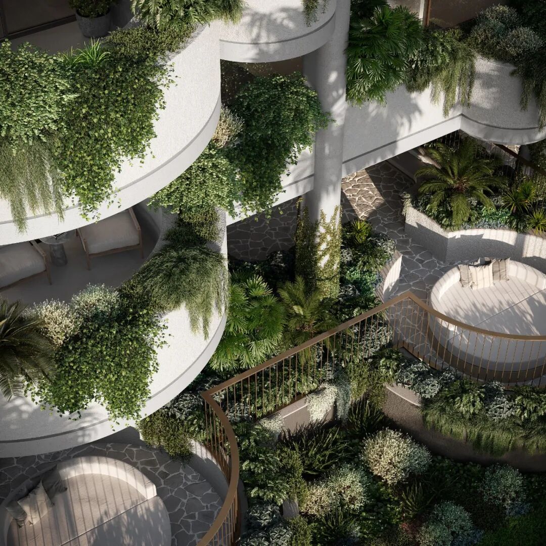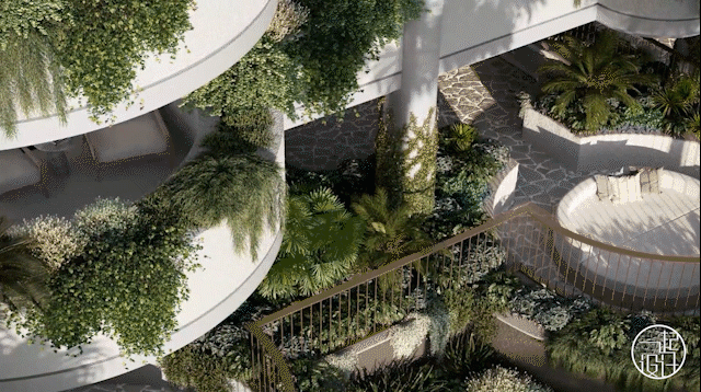 阳台四周覆盖了大量的绿植,营造出了自然舒适的宜居场所,也使得建筑与周围自然环境更加和谐。