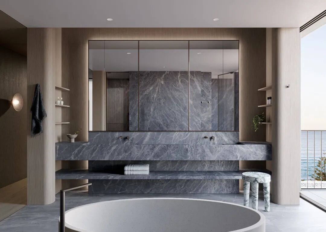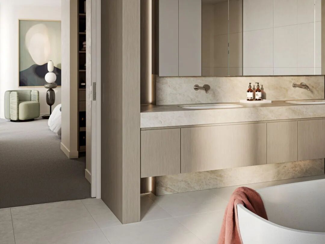 过衣帽间就来到了与卧室配套的主卫区域,一体式的大理石双洗漱台,打造出左右对称布局,也满足了两人同时使用的需求。