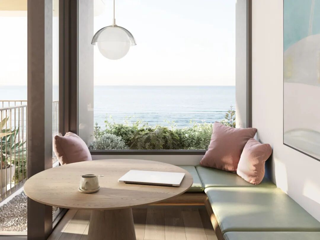 阳台做全封闭设计,卡座与圆桌的加入使其变成一个小的休闲或办公区,还可以在这远眺室外的海景。