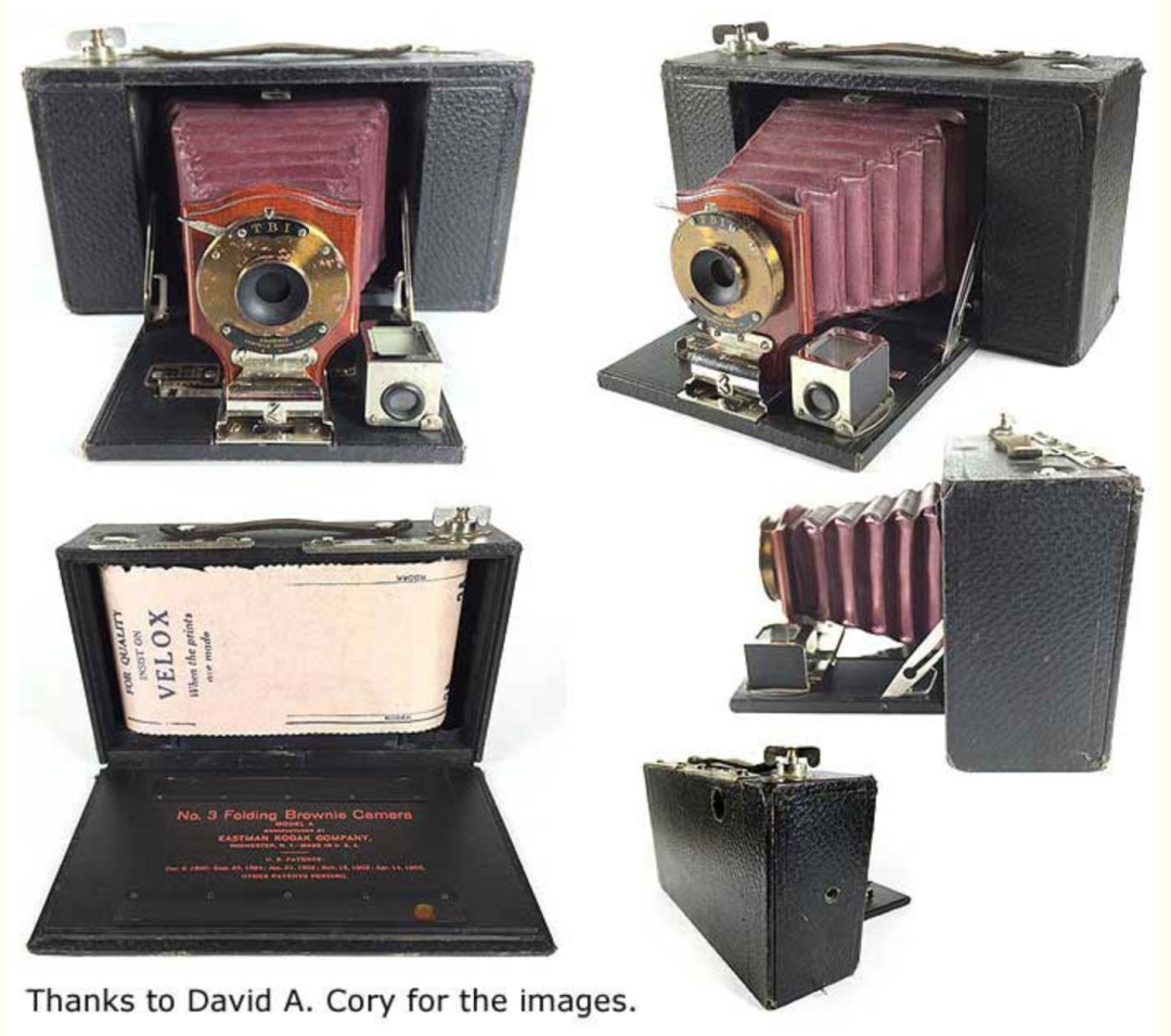盒式的设计在某些方面是有局限性的,主要是因为它不紧凑。其他相机,包括柯达的许多相机,都使用了风箱,这使得相机可以从拍照的形状折叠下来,变成口袋大小,更容易携带。第一台折叠式布朗尼相机出现在1904年,它是一种带有红色风箱的卧式相机,可以将镜头推回机身内。一旦就位,快门和光圈控制,与盒式相机一致,都是有限的,操作简单。立体布朗尼在1905年和1910年之间出售,产生一对立体图像。与柯达的其他折叠式相机相比,布朗尼系列提供的选择很少。折叠式布朗尼主要在1904年至1926年间生产,尽管英国的柯达有限公司在20世纪30年代末和战后初期生产了几个型号,被命名为6-20折叠式布朗尼。
