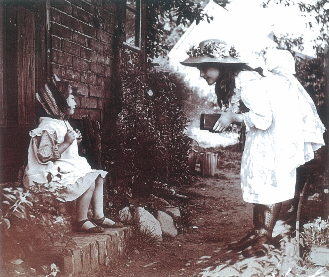 约1905年,一个女孩使用柯达布朗尼相机拍照。