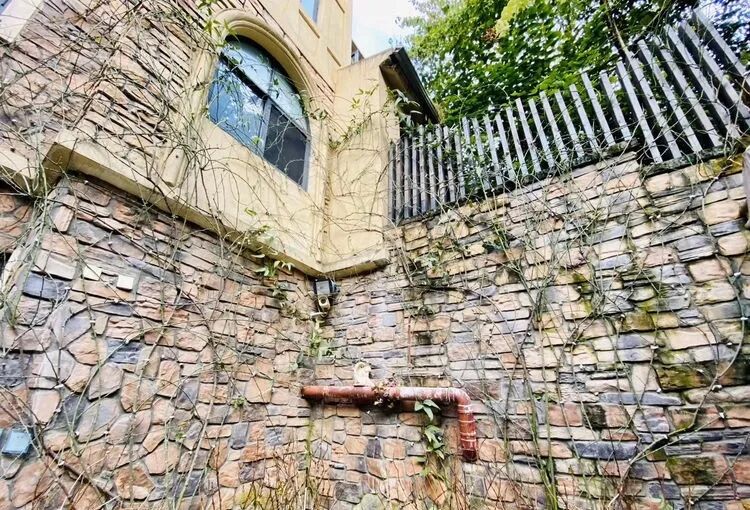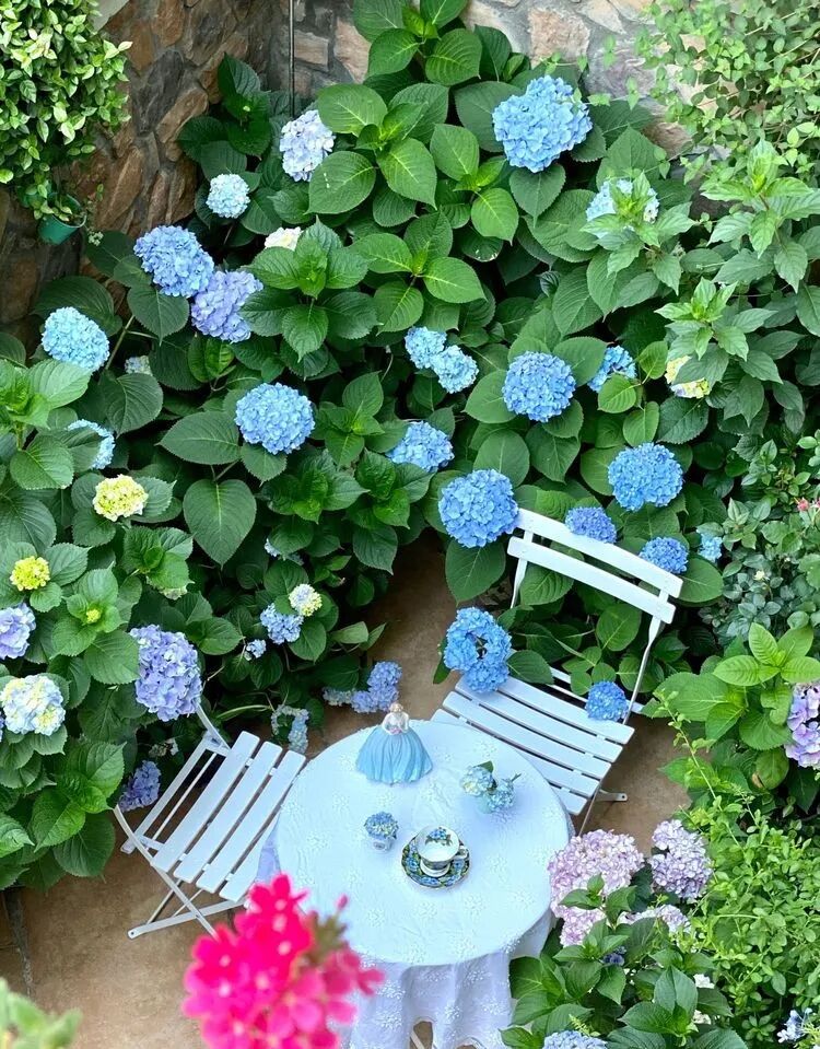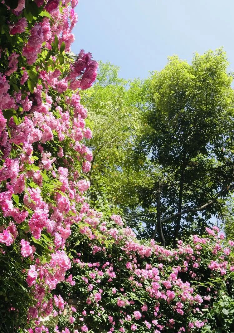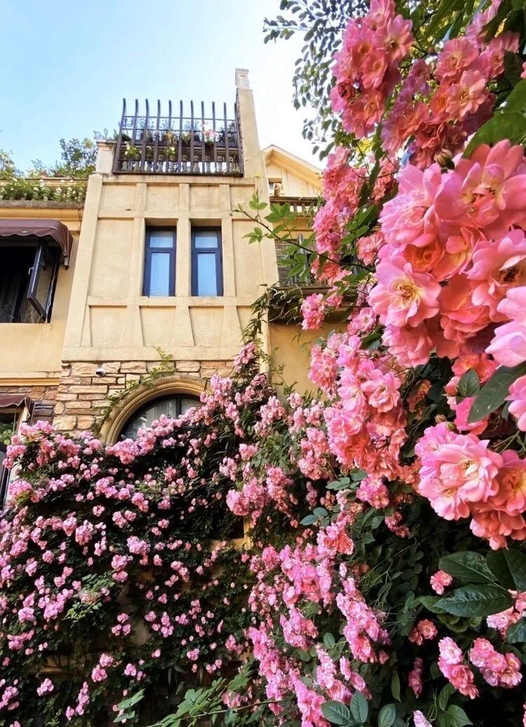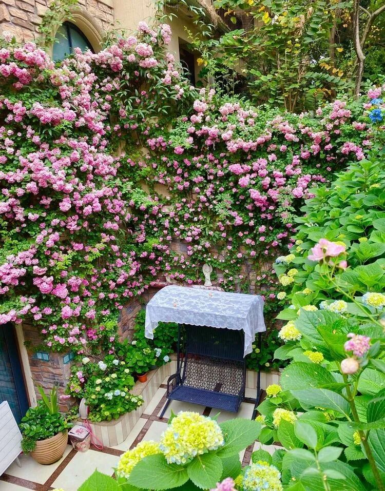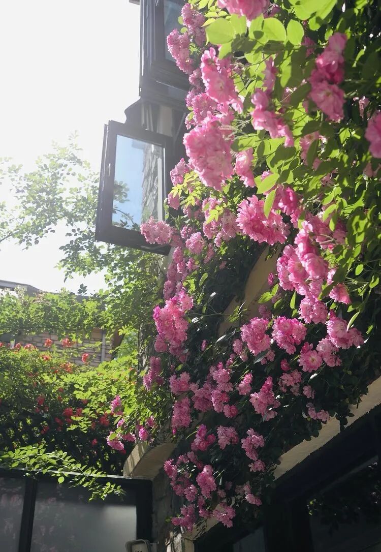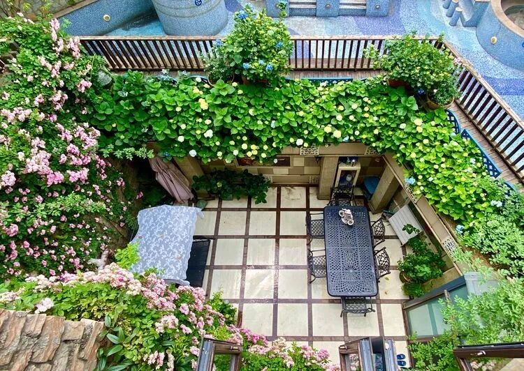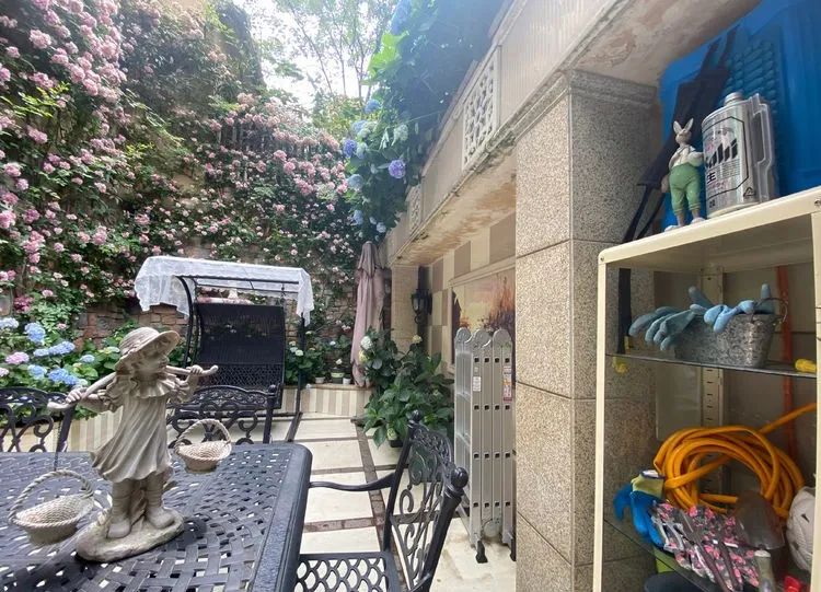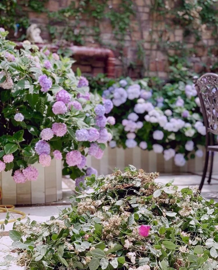 这是一个50多平方米的下沉式花园,主角是月季苹果花与铁线莲爬墙,月季苹果花墙对面和苹果花,衬托着绣球无尽夏,还有紫色的芙蓉花、栀子花、姬小菊、矾根,多肉植物、时令花草相得益彰~