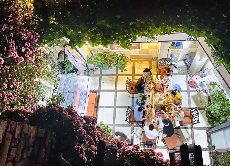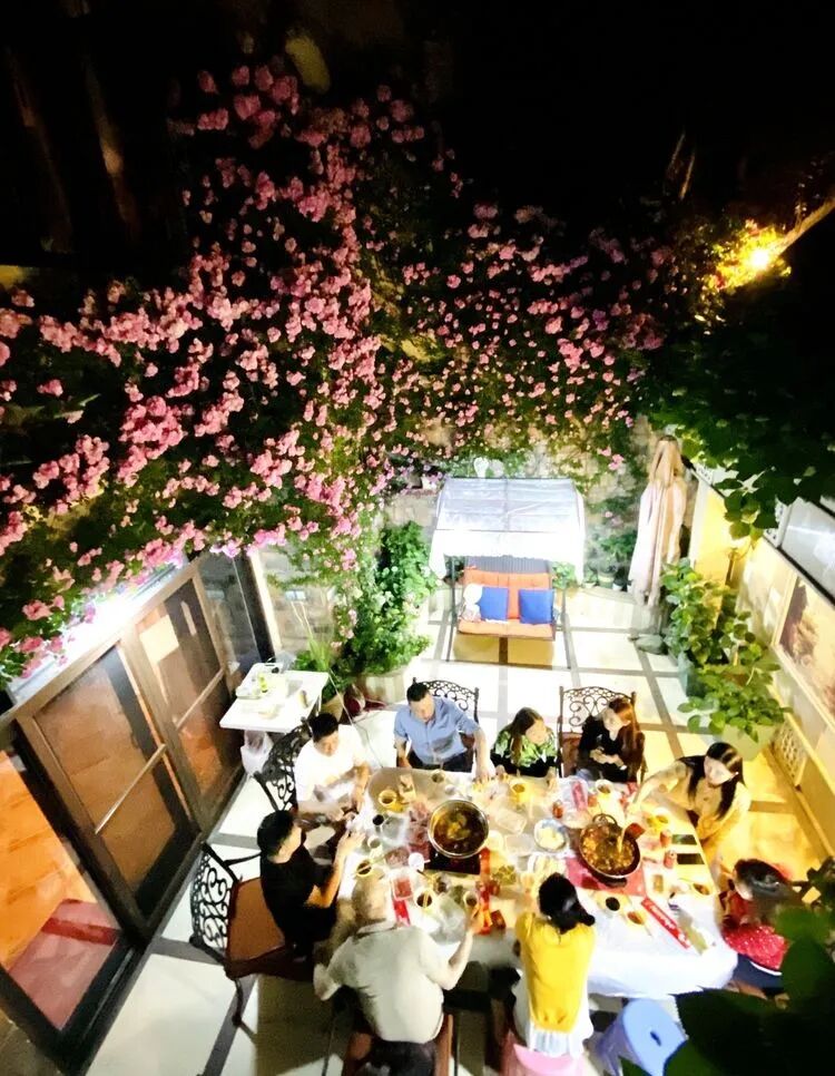 夜幕降临后在苹果花墙下吃火锅是不是很酷?