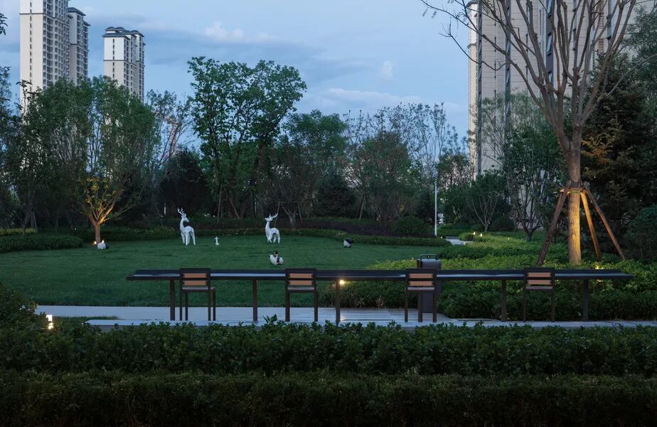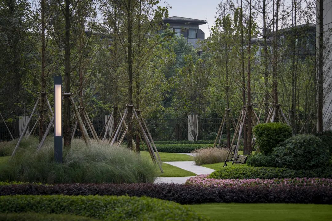 为了营造一处真正的森林度假住所,设计师提出“自然客厅,都市森居“,寻找都市生活和自然环境的平衡关系,回归生活本质的感受,融入生态、时尚、艺术等元素。使城市肌理与自然生境建立连接,以花园式轻奢度假风为项目定位,打造现代高端的森居生活景观。