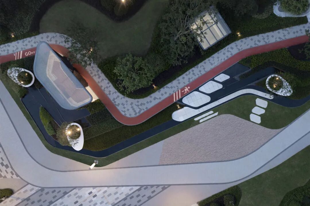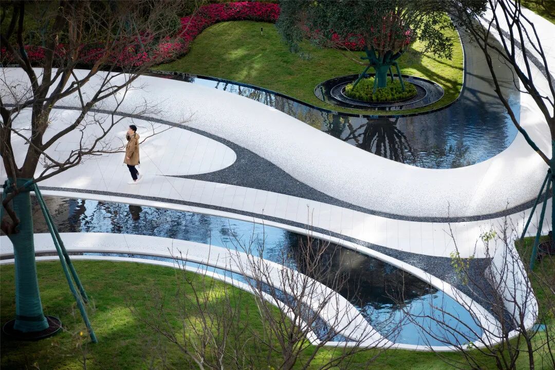 曲线的包裹性,将道路、景观小品及场地空间巧妙连接,宛如山涧历险,勾起访客探索世界的好奇心,观云于海,铺开与全局的流动感及浑然气息。